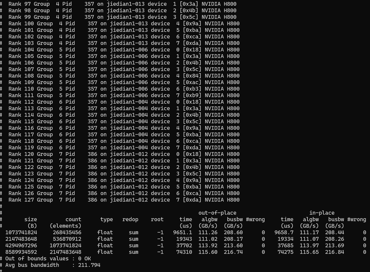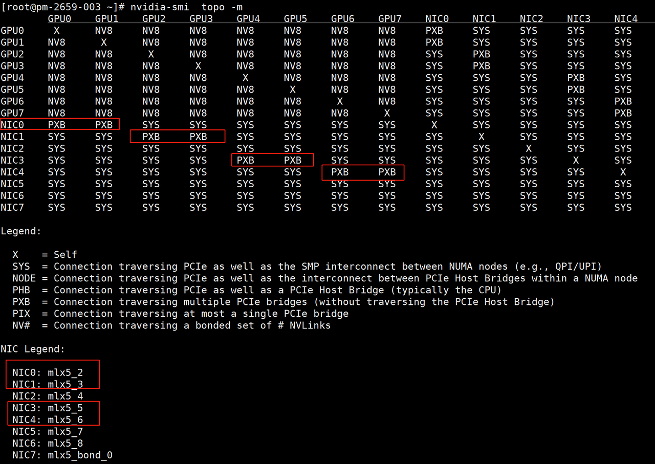 上图中mlx5_2、mlx5_3、mlx5_5、mlx5_6为计算用的IB网卡,需要确保所有待测机器的IB网卡名称一致。(遇到过H800 PCIe版本的服务器仅根据拓扑无法确认IB网卡名称,可进一步结合1.2.2的方法进行交叉验证)