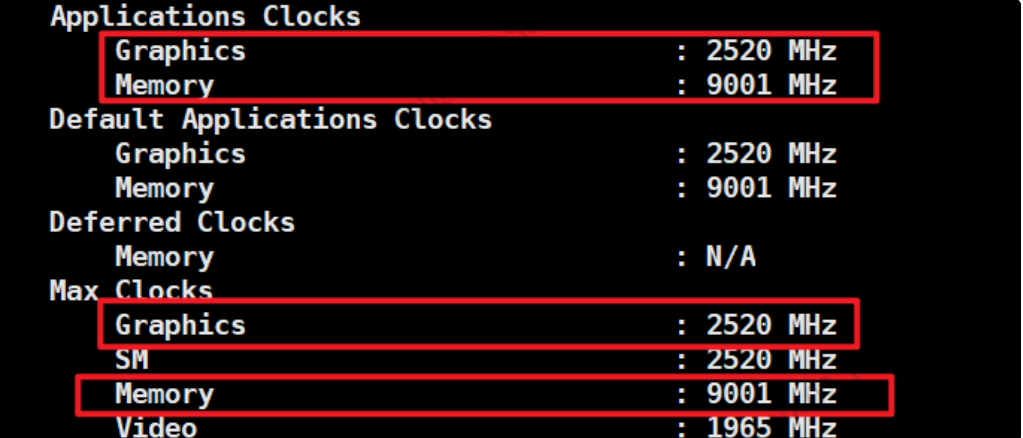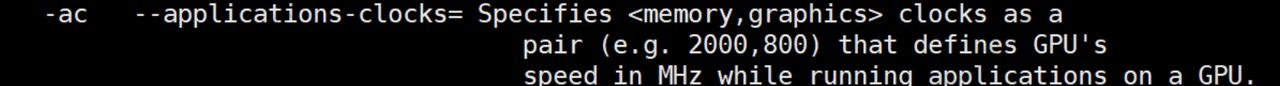 依次检查每一张GPU卡的Applications Clocks是否等于Max Clocks,如果不相等,用nvidia-smi -ac命令将Applications Clocks设置成Max Clocks,-ac参数用法如下: