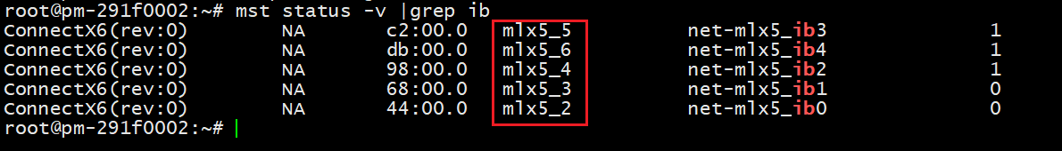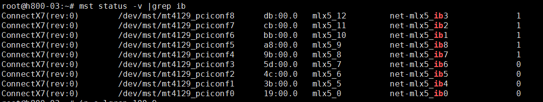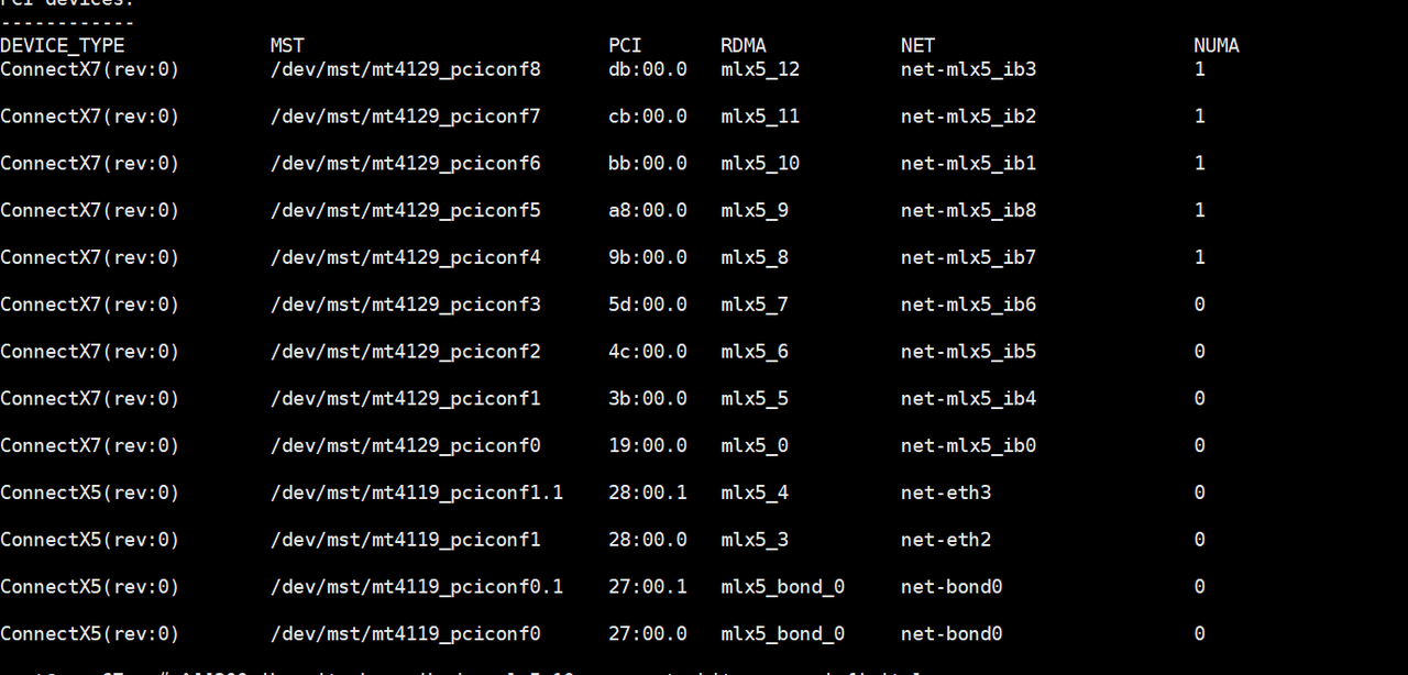 上述mst命令输出机器上所有IB网卡名称,包括用于存储的IB网卡以及用于计算的IB网卡,需要进一步区分计算IB网卡和存储IB网卡。