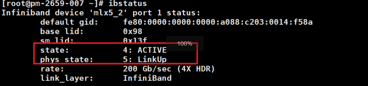 确保1.2中查询的ib网卡状态均为“ACTIVE”和"LinkUp"。