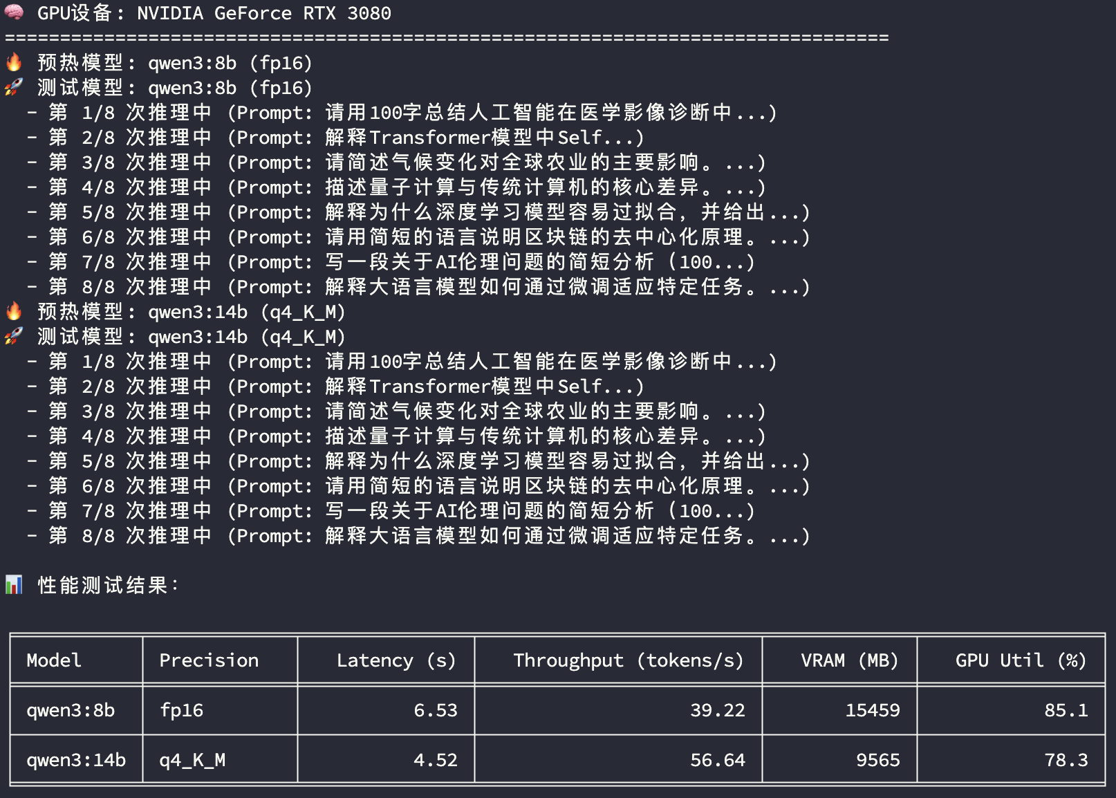 借助DeepSeek 生成测试脚本,使用复杂度近似的8个prompts;MAX_TOKENS配置256,让每次请求需要一定的生成时长便于采样显卡的使用指标,减少波动;同时需要模型预热,消除第一次推理响应延时过大的问题。