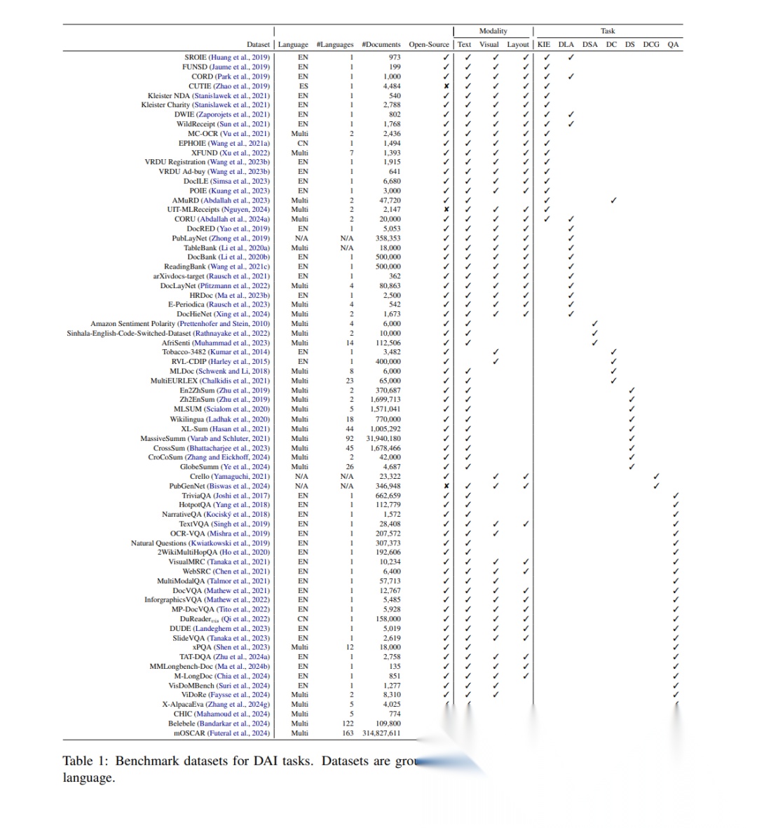 LLMs 在 DAI 领域的发展与应用,已成为当前的核心研究方向。实现多语言与多模态能力是模型应对多样化真实场景的关键(Xu et al., 2024b; Zhu et al., 2024b)。近期的研究致力于融合多语言性与多模态性,以增强统一文档表示学习(unified document representation learning),从而提升 LLM 的通用性与鲁棒性(Hu et al., 2024a)。