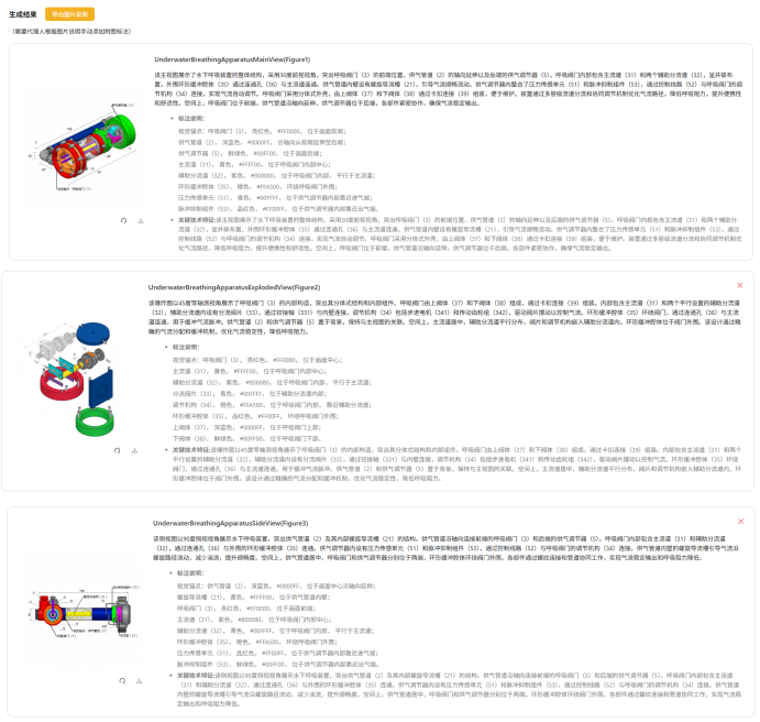 在文本生成后,点击“生成图片”,系统依据前序生成的具体实施方式中的文字描述,精准地生成机械图,可生成主视图,剖视图,爆炸图和随机细节图,并支持机械图部件说明单独导出(word)。