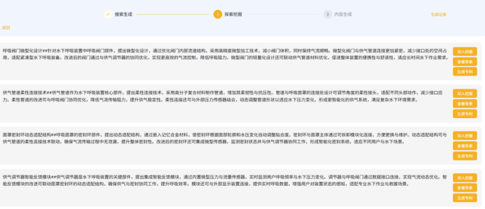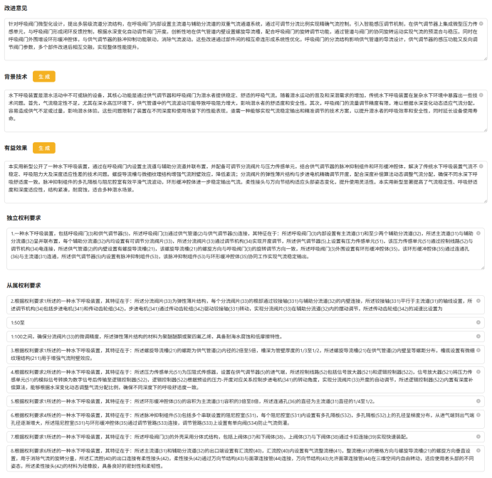 输入一个名称“水下呼吸装置”作为案例。此类装置结构复杂、部件多,是检验雅典娜AI处理复杂技术方案能力的绝佳案例。
