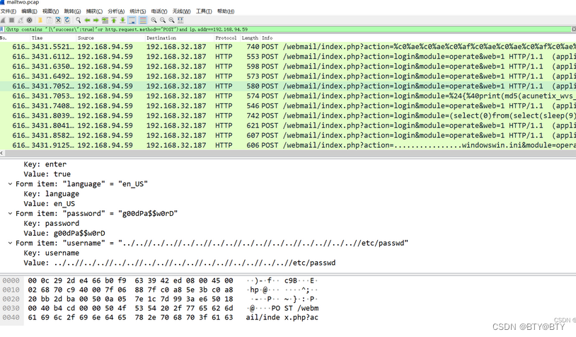 先查询下mailtwo.pcap这个数据包,一开始利用POST和mail过滤了下