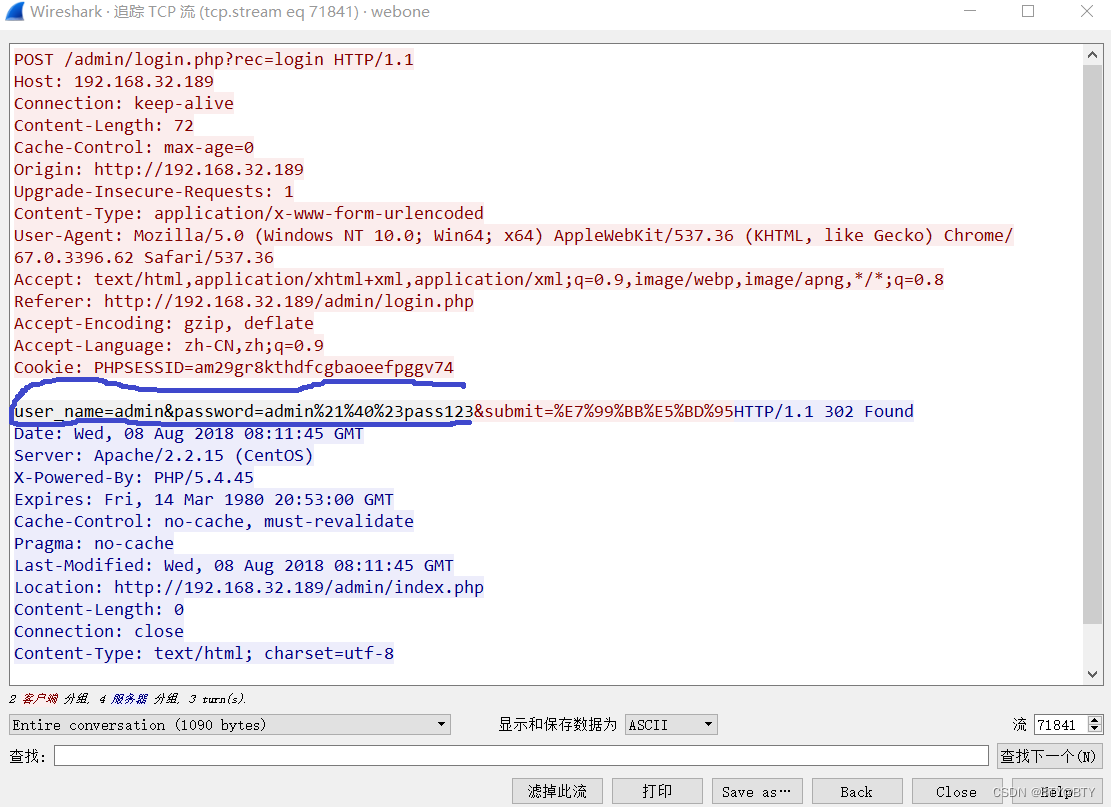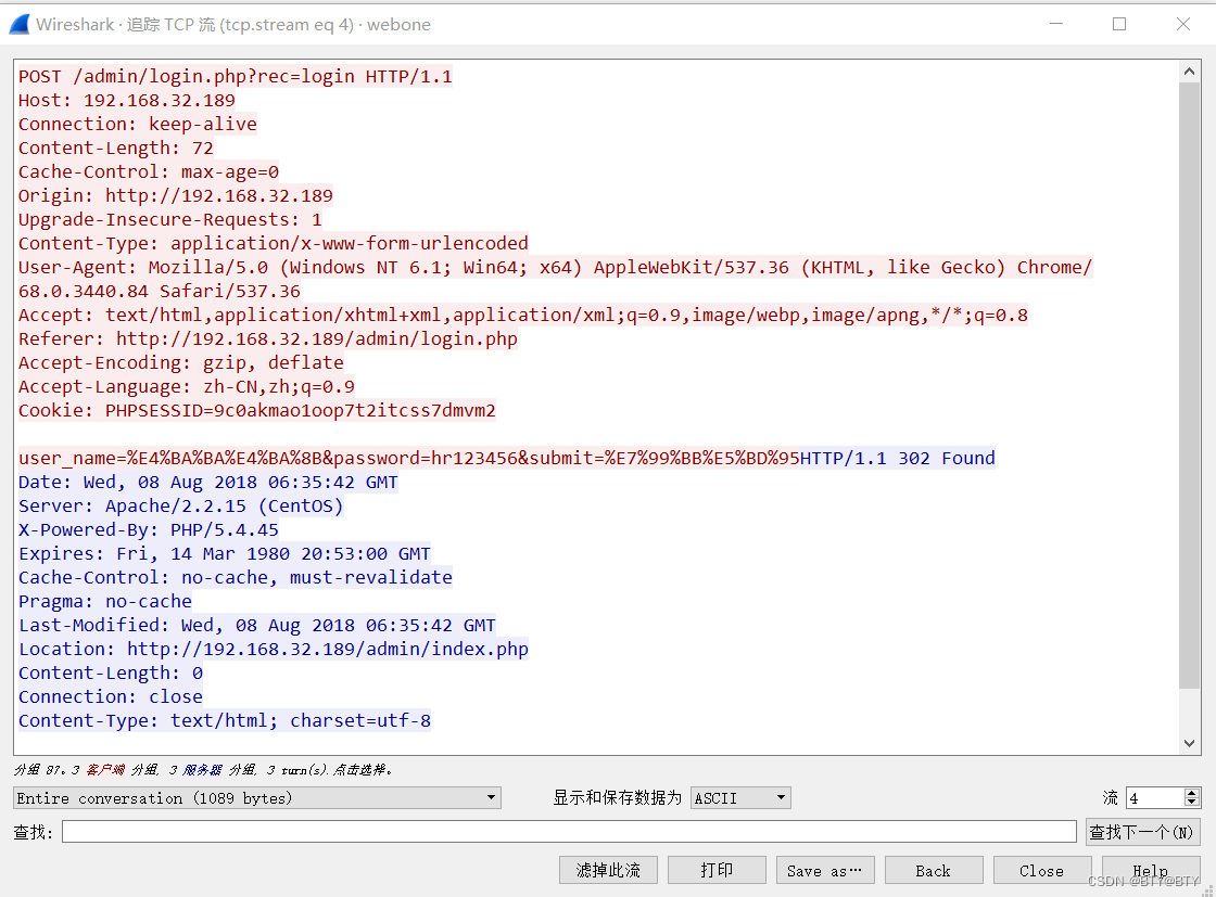 根据第一条流量就可以看到后台地址,然后右键追踪流量的tcp流,发现302重定向,表示后台地址登陆成功