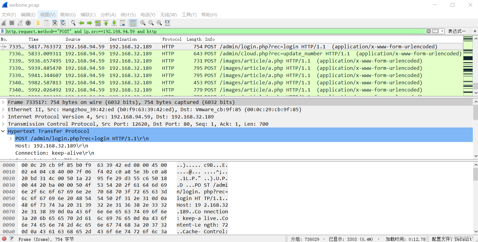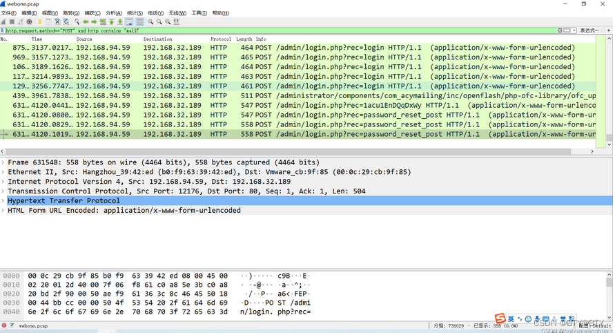 根据过滤之后结果可以知道黑客使用的扫描器为awvs,同样可以看到扫描者的IP地址为192.168.94.59