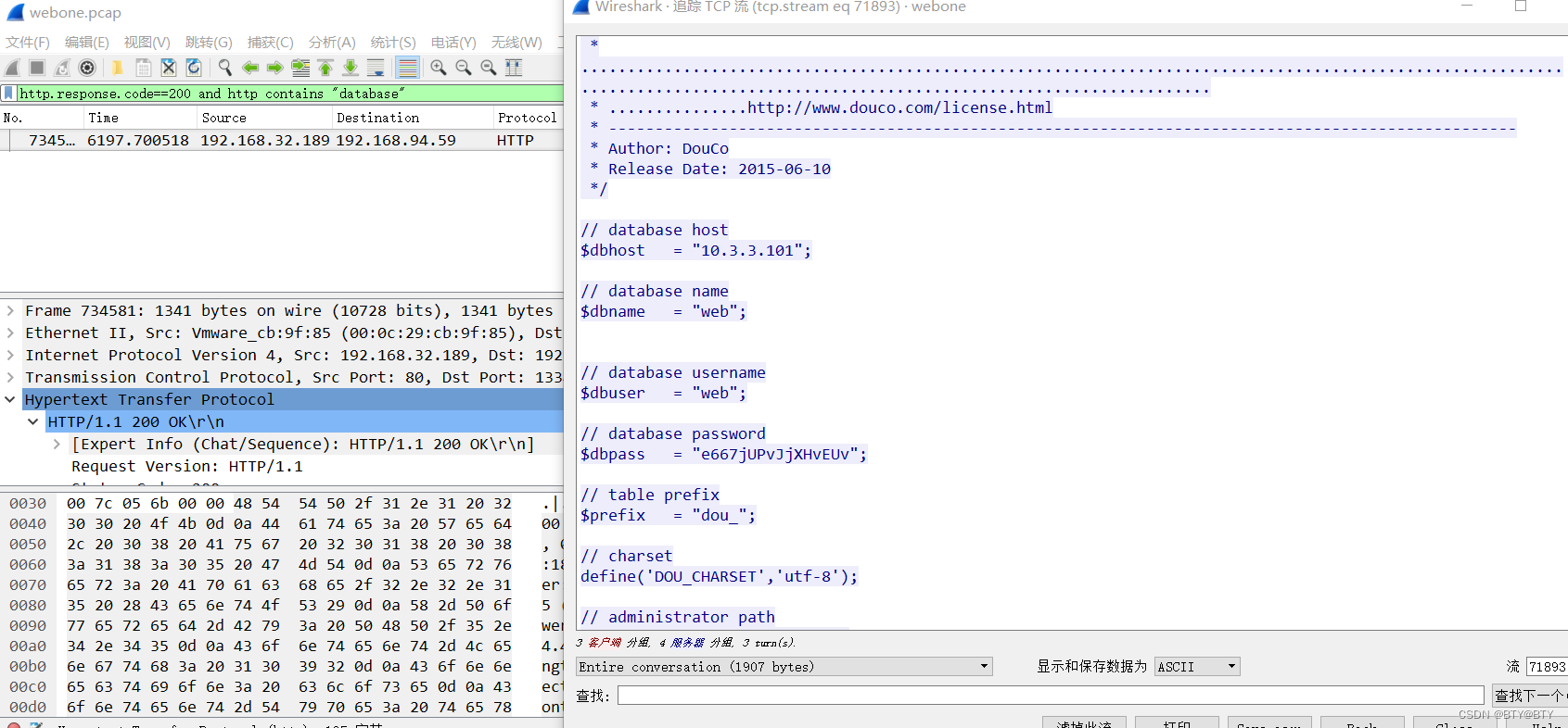 某公司内网网络被黑客渗透,请分析流量,黑客找到的数据库密码是多少?