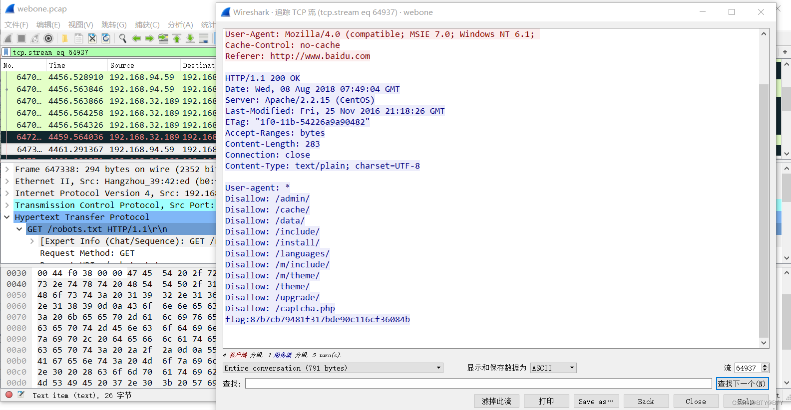 某公司内网网络被黑客渗透,请分析流量,黑客在robots.txt中找到的flag是什么?