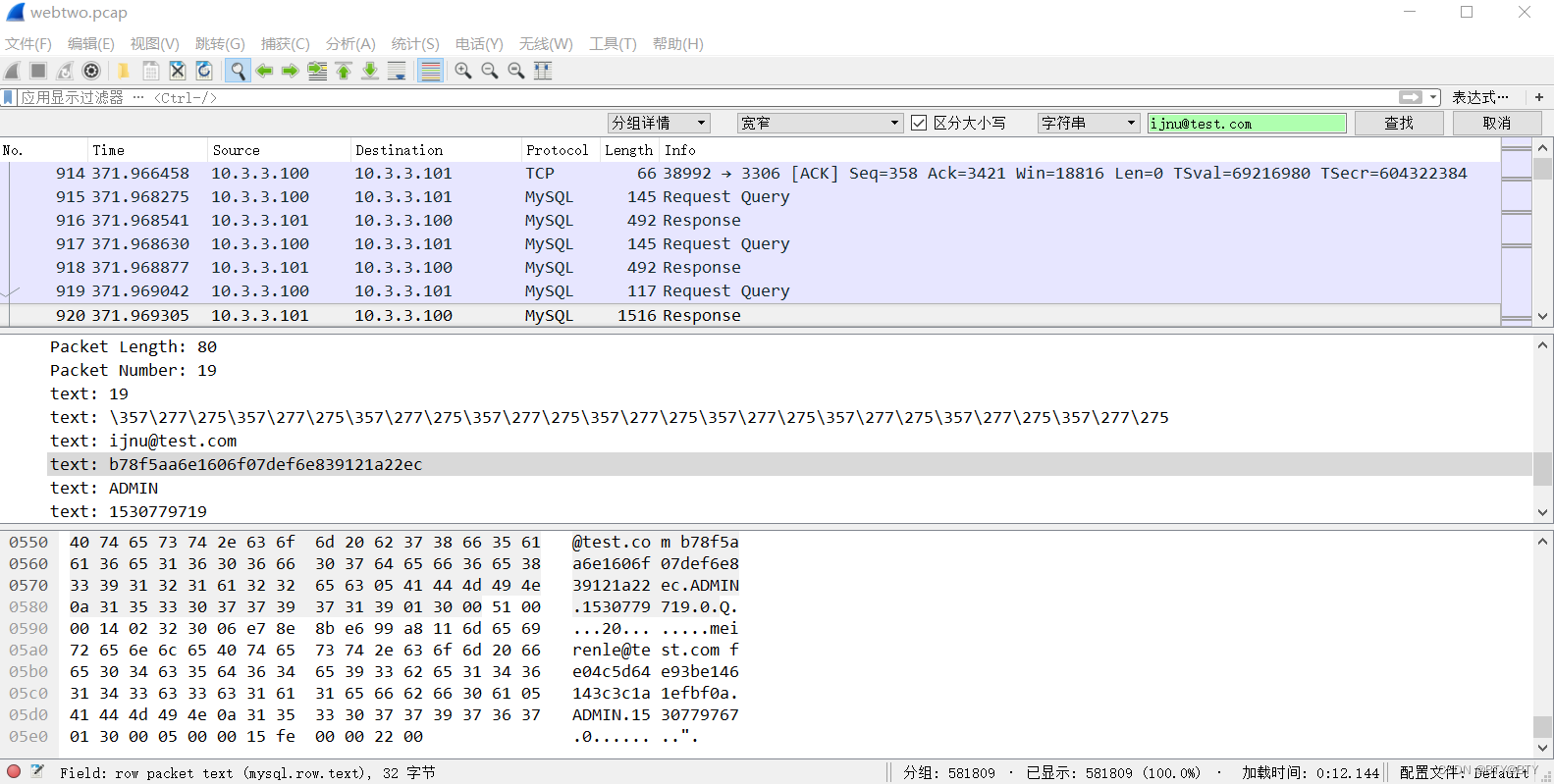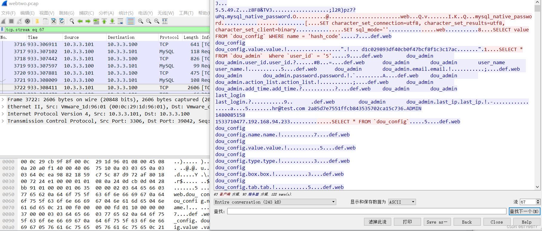 打开webtwo流量包,先进行过滤关键字,并且根据上一题可以知道数据库主机的IP地址为10.3.3.101