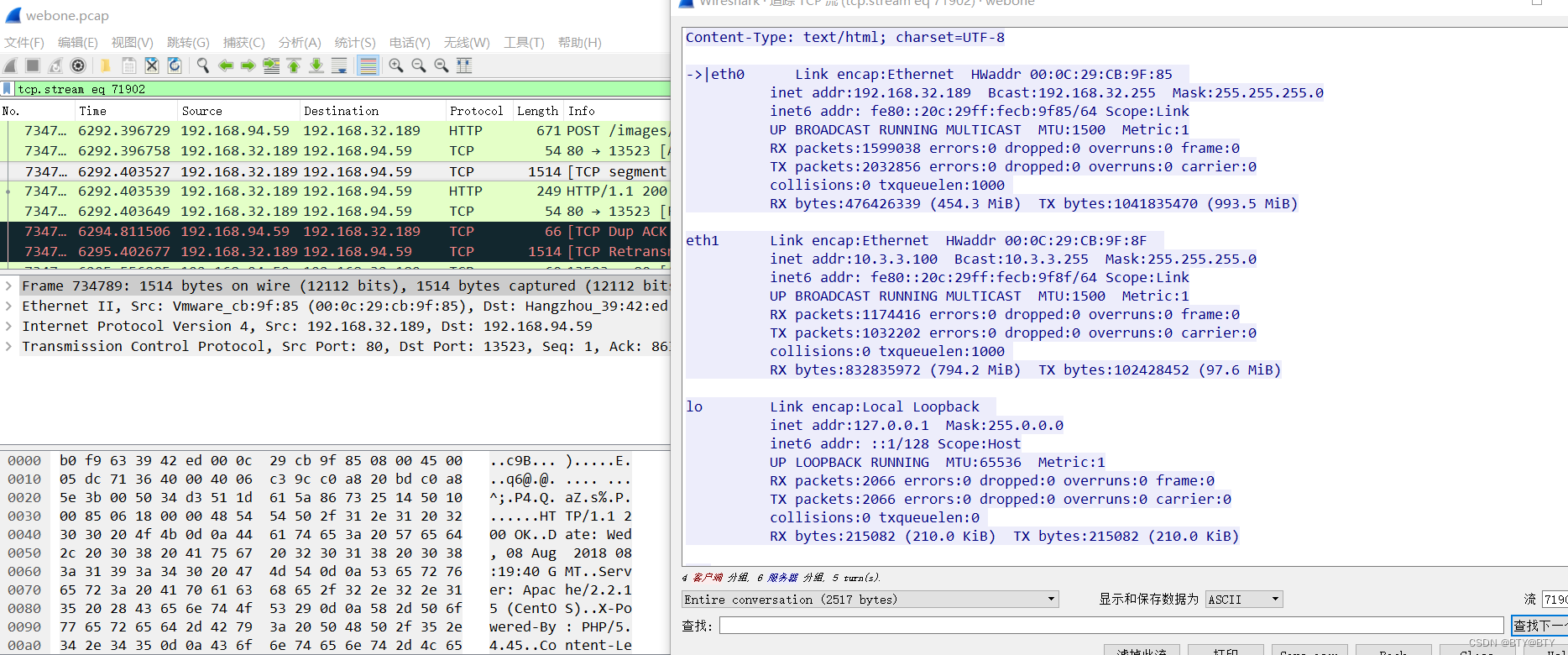 某公司内网网络被黑客渗透,请分析流量,被黑客攻击的web服务器,网卡配置是是什么,提交网卡内网ip?