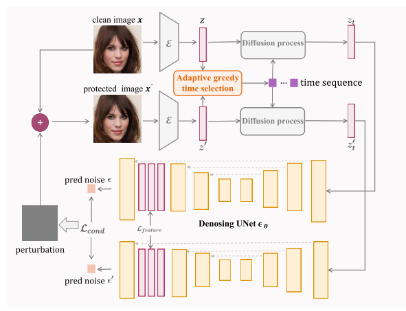 其根本原因是这些方法未能将对抗性攻击与扩散模型固有的性质结合起来。我们的目标是深入分析为什么扰动图像的梯度在不同的时间步长上不同,以及扩散模型如何在不同的中间层感知输入图像。然后,在深入分析的基础上,从时间维度和特征维度两个方面对现有的定制方法进行了改进。