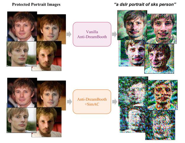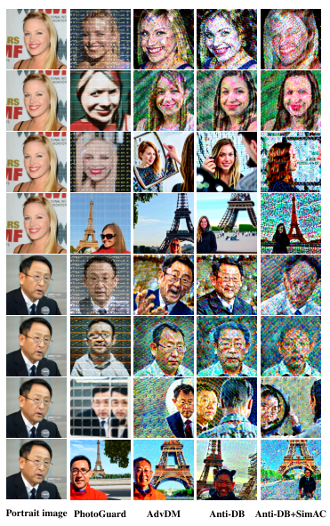 图1.添加SIMAC前后Anti-DreamBooth的比较。我们的方法进一步增强了它去身份的能力。