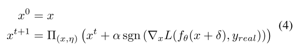 其中x是输入图像,sgn(·)是符号函数,(∇xL(fθ(x+δ),yReal)是损失函数相对于x+δ的梯度。α表示每次迭代期间的步长,t是迭代次数。通过Π(x,η)运算,噪声被限制在η球内,确保对抗性例子是可接受的。