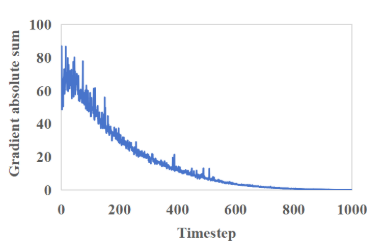 我们的探索集中于从统计学的角度分析不同时间间隔的梯度。我们已经建立了1E−10的阈值,以评估不同时间步长的扰动图像中绝对值低于该阈值的渐变数量。图5显示了一个显著的趋势:在总时间间隔的后半部分(0,MaxTrainStep),低于指定阈值的绝对渐变计数急剧增加。此外,图5显示了当时间步长变大时,扰动图像中绝对梯度的最大值、平均值和中位数减少。