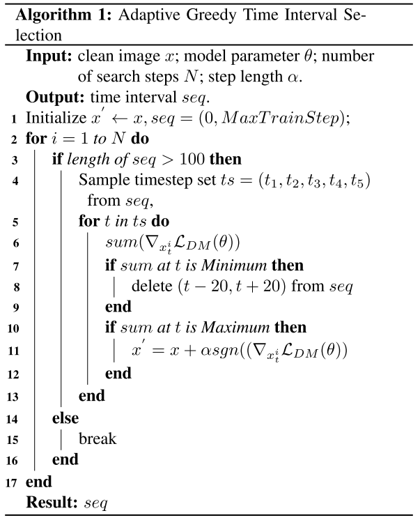为了在有限的噪声注入步骤中实现更有效的隐私保护,我们提出了一种快速自适应时间间隔选择策略。首先,在输入图像的基础上,从区间(0,最大训练步长)中随机选取5个时间点。对于每个时间步长,我们计算关于输入图像的梯度。对梯度的绝对值求和。如果绝对梯度值的和在时间步长t是最小的,则相应的间隔(t−20,t+20)被移除。对于具有最大和的时间步长,计算噪声并将其添加到图像中,该噪声图像成为下一轮梯度计算的输入。重复该过程,直到最终时间间隔长度不大于100。我们得到了用于噪声注入的最终间隔。