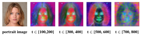 在去噪过程中,我们基于噪声潜伏期zt重建输入图像X0,并在不同的时间步长上可视化重建图像与输入图像在频域中的差异。如图4所示,当t∈[0,100]时,原始图像和重建图像之间的主要区别在于高频分量。我们最初的期望是通过引入高频对抗性噪声来扰乱原始图像的重建,旨在实现反定制。然而,当t增加时,例如t∈[700,800],重建图像和输入图像之间的低频分量的差异主导了两者之间的大部分频域差异。因此,这可以解释为什么当噪声调度器的时间步长较大时,扰动图像的梯度接近于零,从而导致噪声优化效果不佳。