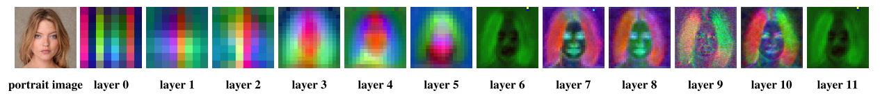 受[31]的启发,在去噪过程中,我们利用主成分分析来可视化U-Net解码块中每一层的输出特征。解码块由自我注意块、交叉注意块和残差块组成,我们选择残差块的特征。总共有11个层,这些层在TimeStep=500处可视化。如图6所示,随着UNet解码器块输出特征的增加,可视化特征逐渐从描述结构等低频信息转变为捕捉纹理和类似的高频信息。由于我们的噪声是为了扰乱高频信息,所以更深的特征是我们的对抗性噪声的良好扰动对象,以加强试图扰动生成的图像中的高频分量的干扰。