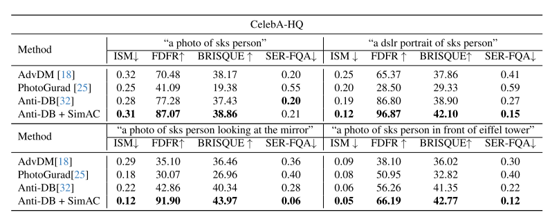 表1.在CelebA-HQ数据集上与其他开源反定制方法的比较。在定制过程中,我们评估了四种不同提示下的性能,其中ISM和SER-FQA越低越好,FDFR和BRISQUE越高越好。