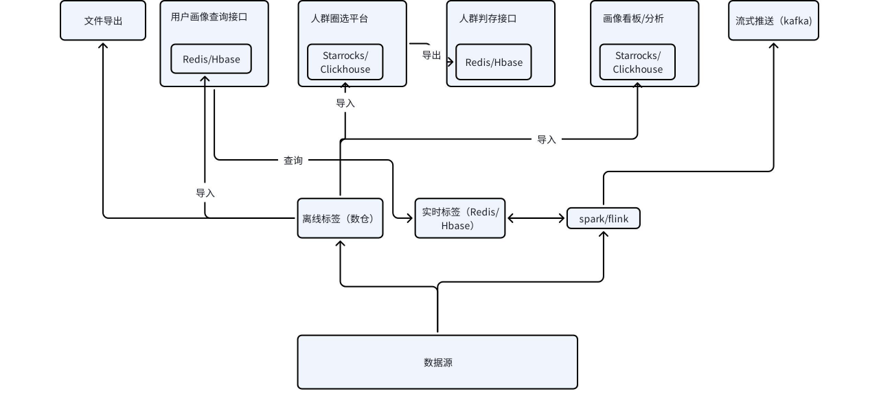组件 工具/框架 特点 实时计算引擎 Flink 支持实时流式计算,用于动态更新标签和行为数据。 离线计算引擎 Spark 用于批量处理历史数据,生成静态标签宽表。 存储引擎 Apache Doris / ClickHouse 支持高效查询和BitMap交并差操作,适合人群圈选和画像统计。 缓存层 Redis 缓存高频查询结果(如热门人群ID的用户列表)。