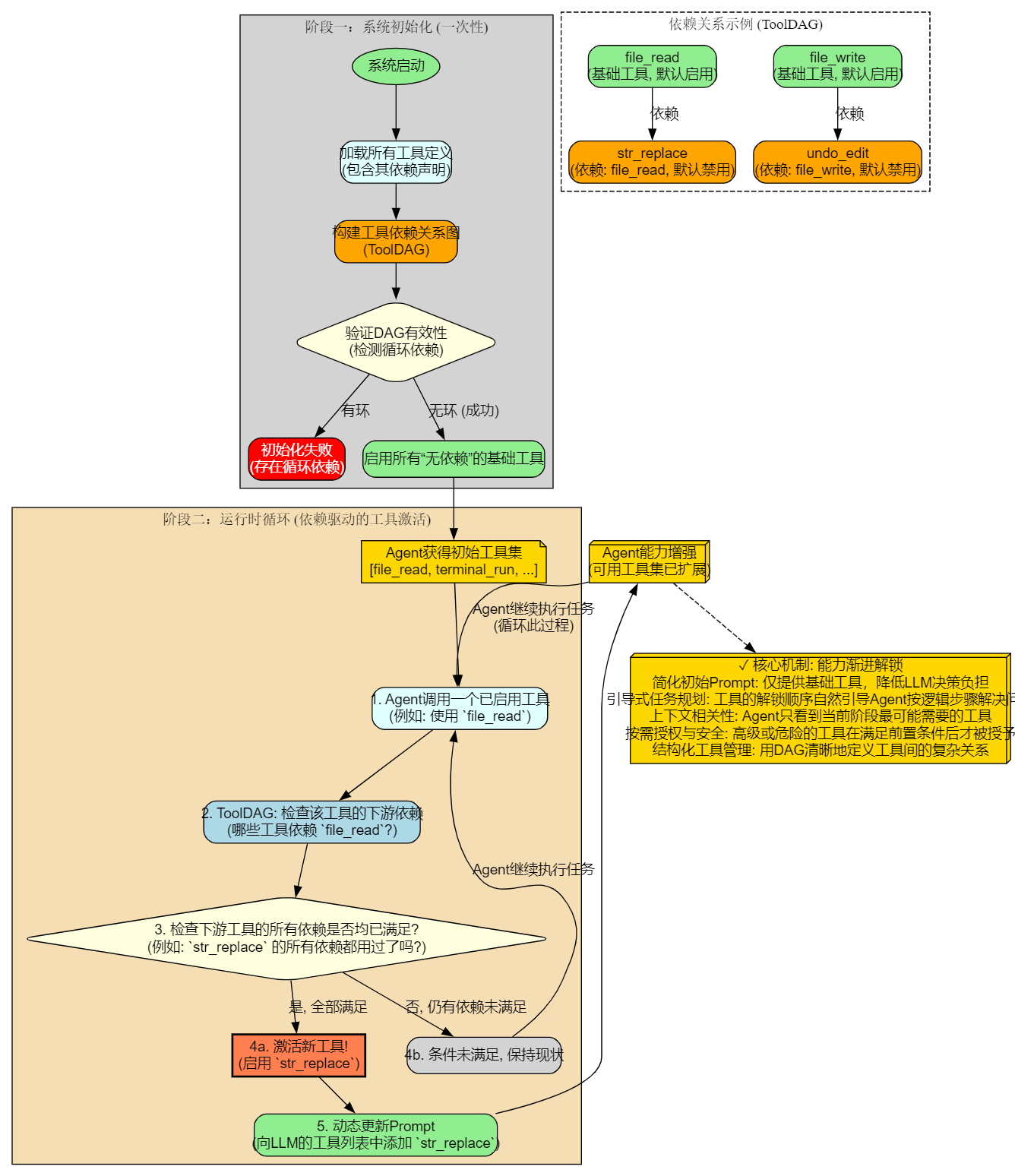 灵活的启用条件:LeastOne这种特殊依赖允许我们定义复杂的启用逻辑,例如"在Agent有过至少一次工具使用经验后,再给它提供并行执行工具"