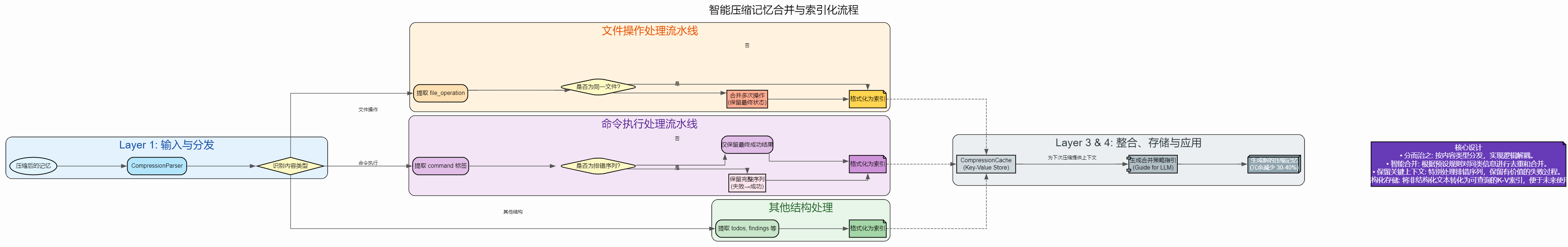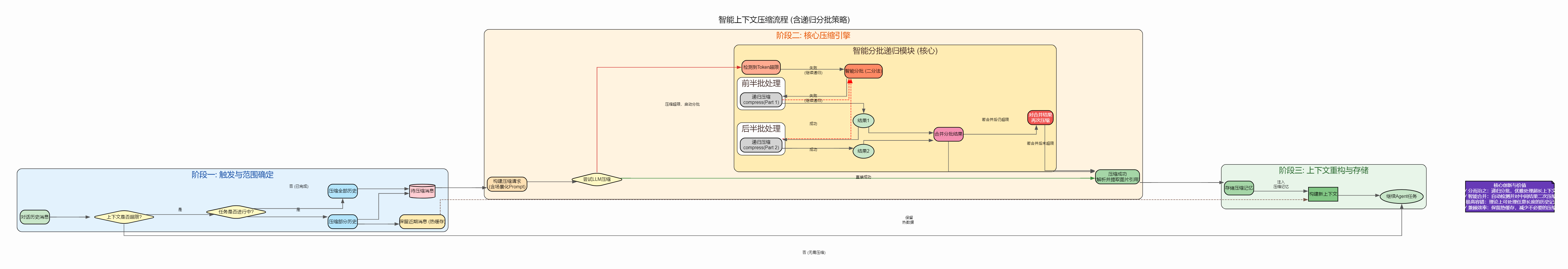 分批递归处理:当单次压缩的内容仍然超过模型限制时,自动进行分批压缩,先压缩前半部分,再将压缩结果与后半部分合并后继续压缩
