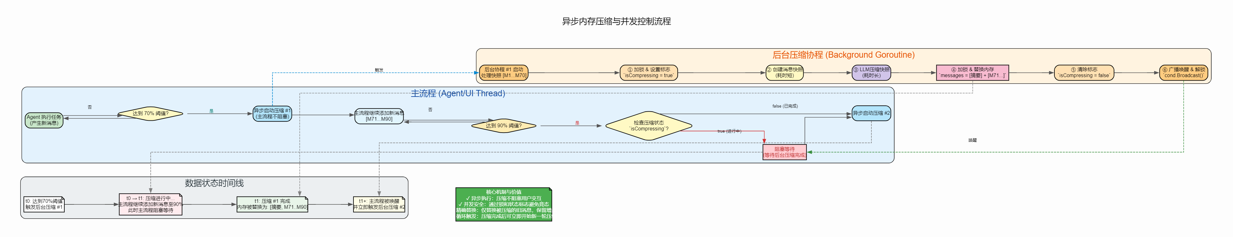 异步压缩机制:当检测到token接近限制时,启动异步压缩goroutine,主流程使用条件变量等待压缩完成,避免阻塞用户交互