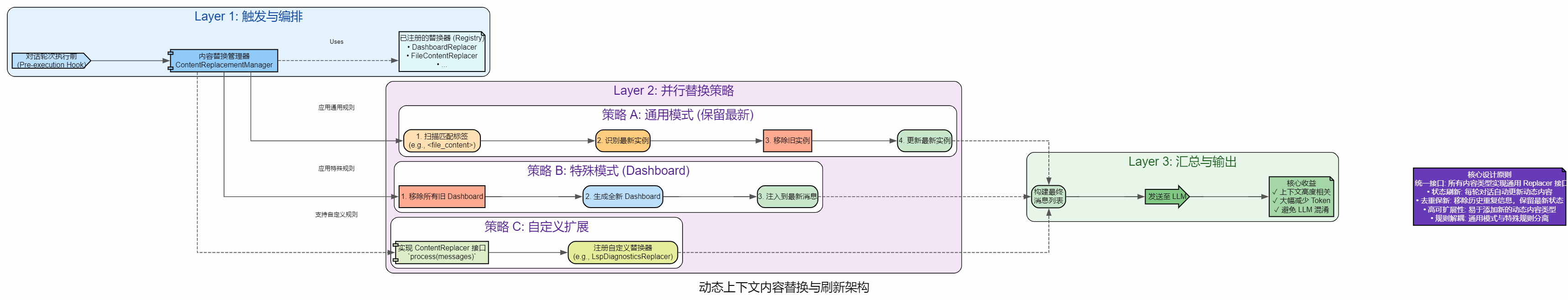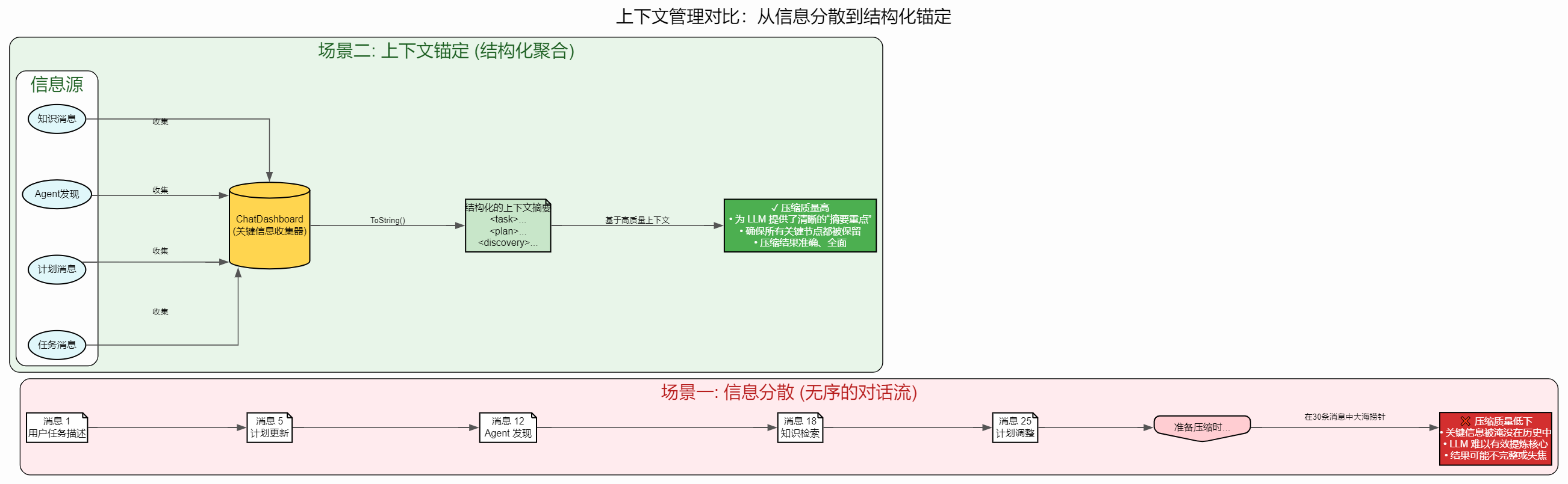 压缩 + 替换 + 保留:压缩处理历史信息,替换更新过时内容,dashboard保留实时状态,三者配合确保上下文始终保持"精炼、准确、完整"