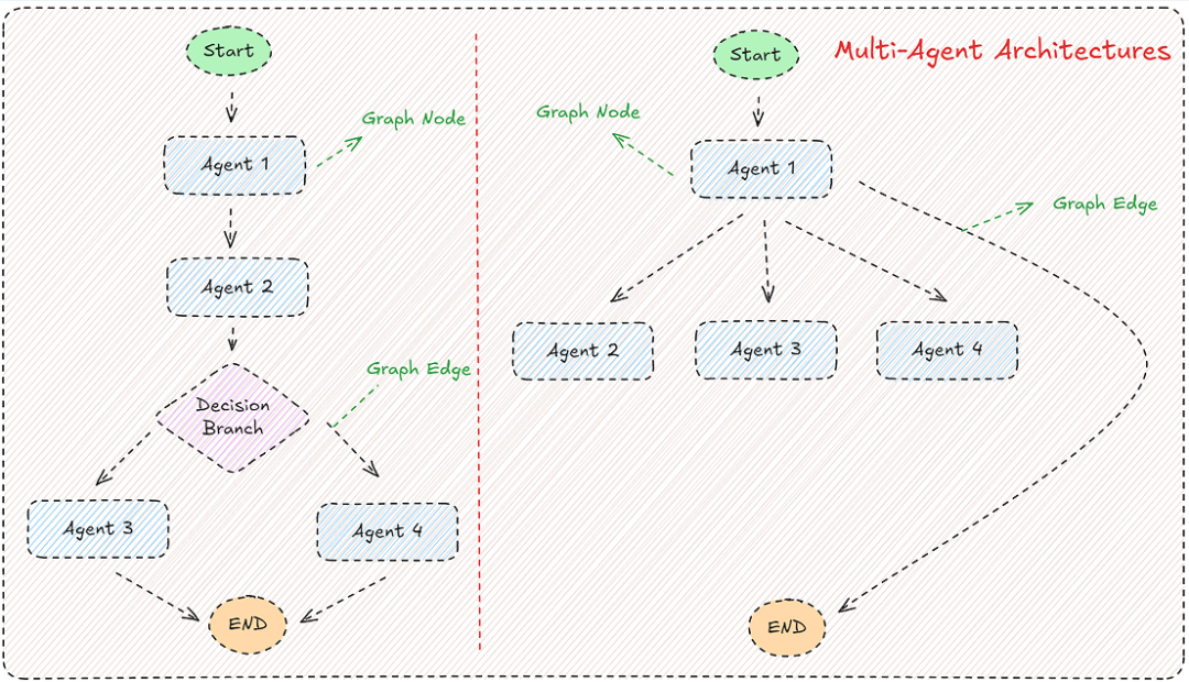 LangGraph是LangChain的扩展,专治图状工作流。常见架构:
