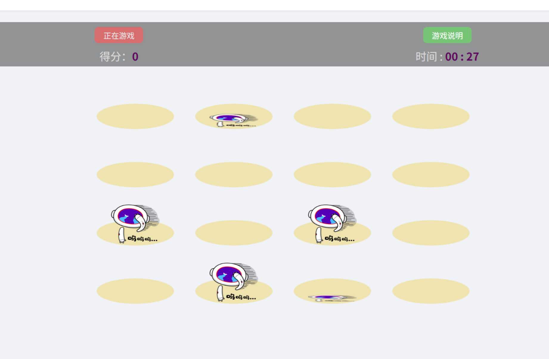 点击开始游戏。在规定时间内(60秒)对块元素_row中的图片_mouseup进行点击操作,点击间隔越小越好。每成功点击一次计分10分,返回最终得分。