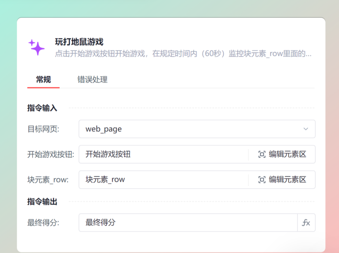 自动化执行:运行指令后,流程会先点击 “开始游戏” 按钮启动游戏,然后在 60 秒内对 “块元素_row” 中的图片进行高频点击操作,每成功点击一次计 10 分,最终将得分输出到 “最终得分” 变量中。