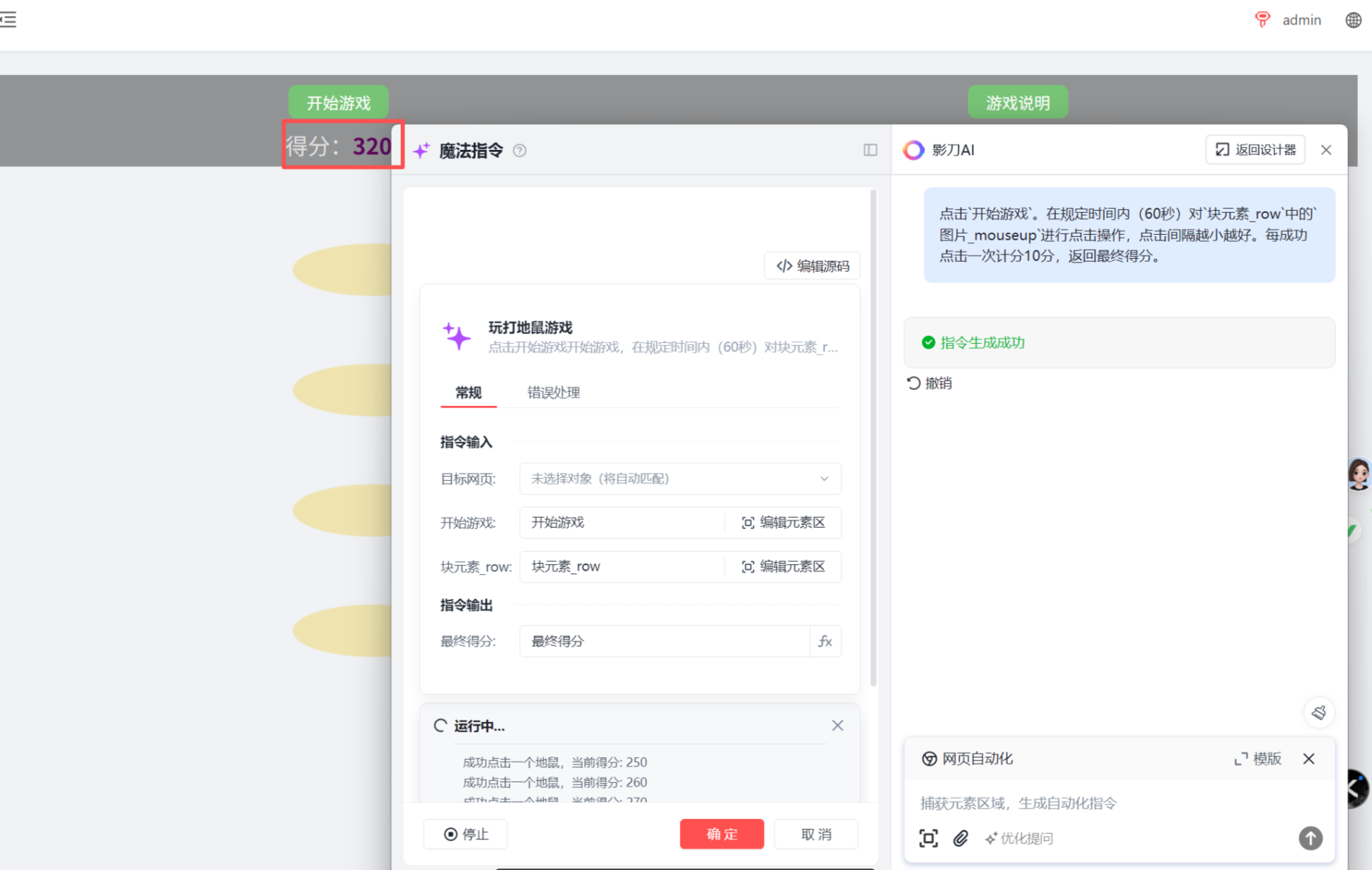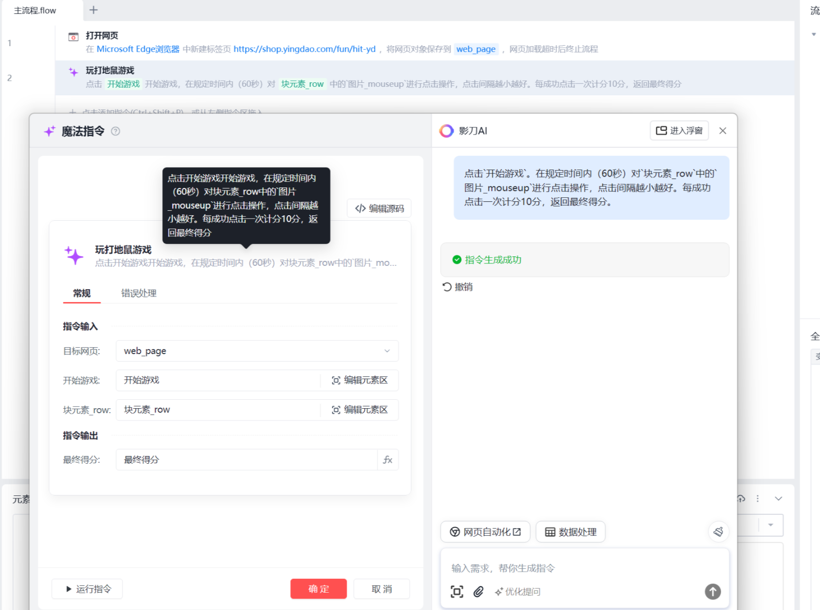 指令生成与配置:通过影刀 AI 魔法指令功能,输入 “玩打地鼠游戏” 的需求,配置目标网页为