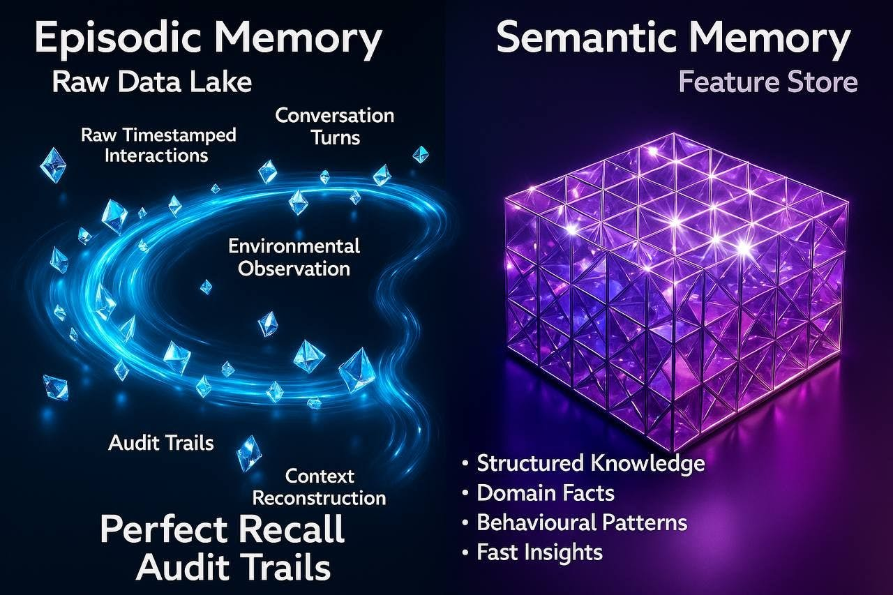 - 情景记忆,存储了原始的、带有时间戳的交互。这些交互不限于每一次对话回合、工具的执行、以及环境观察等属性。它为调试、审计跟踪和上下文重建提供了完美的调用。从数据科学的角度来看,我们可以将其视为“原始数据湖”,它不会丢失或转换任何内容。