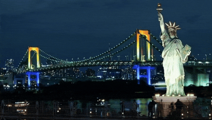 自由女神像在纽约港夜晚的灯光下,底座突然喷出巨大火焰和烟雾,像火箭一样缓缓升空。火焰照亮夜空,气流冲击周围建筑和海面。镜头跟随她加速上升,划出明亮的火焰轨迹。