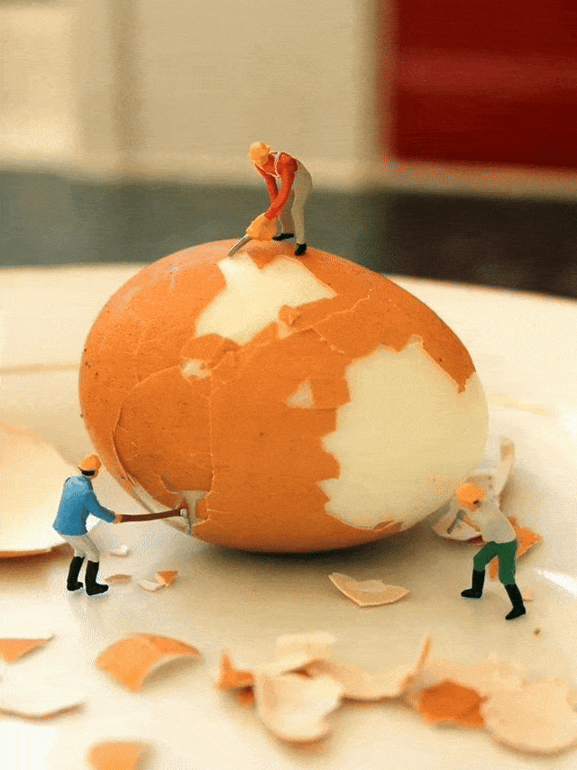 在铺着白色瓷盘的厨房场景里,碎蛋壳散落四周,三位微缩小工人分工协作:顶部工人持锯持续锯蛋壳,左侧工人挥锤不断砸蛋壳,右侧工人用铲清理碎蛋壳,背景的红门与浅色墙面让这场 “蛋壳工程” 更具生活氛围感。