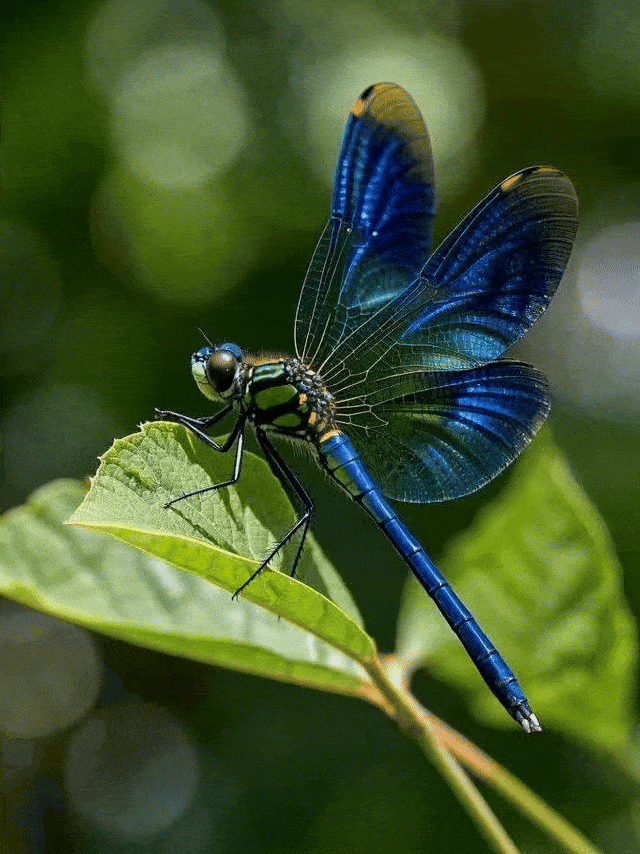 微距摄影,蜻蜓飞到树叶上停留,翅膀微微煽动,可以清晰看到翅膀的纹路