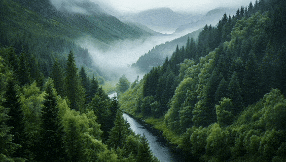 以无人机的视角在森林中穿梭,从森林深处穿梭到海岸。