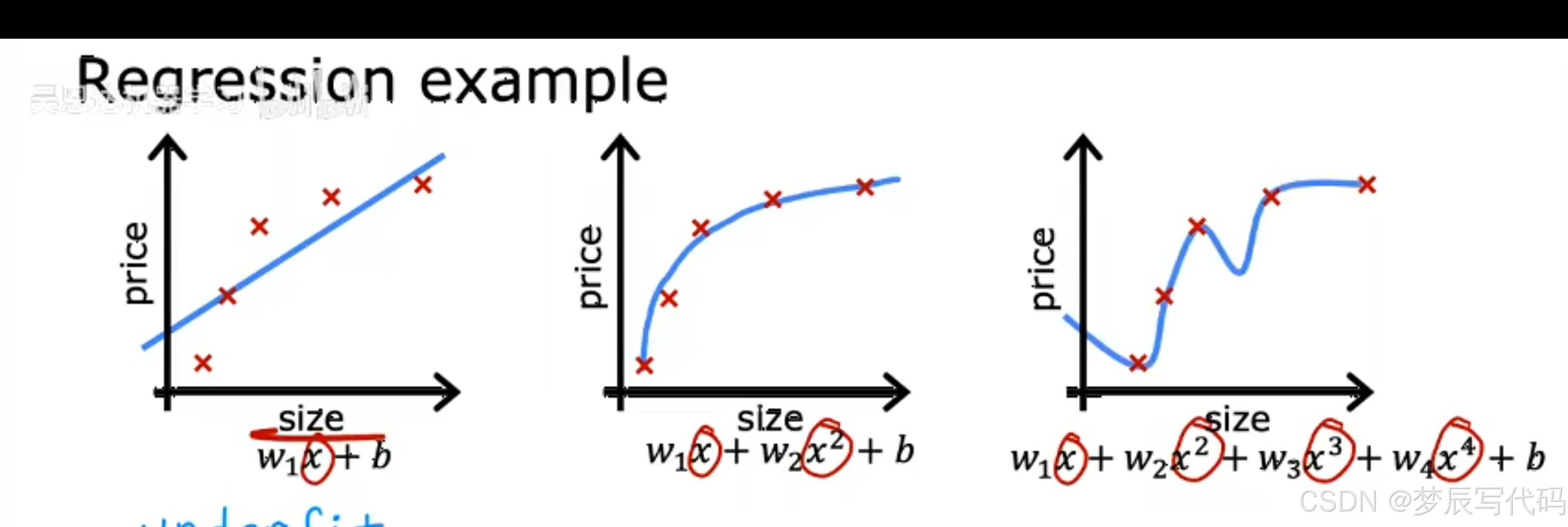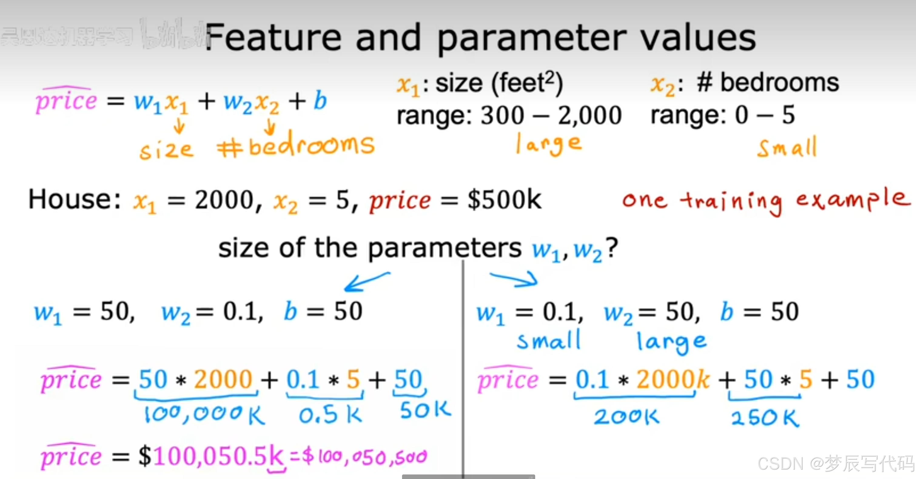 如果你有多个因素x影响价格,那么这种线性模型更加接近现实,它的表达形式如下
