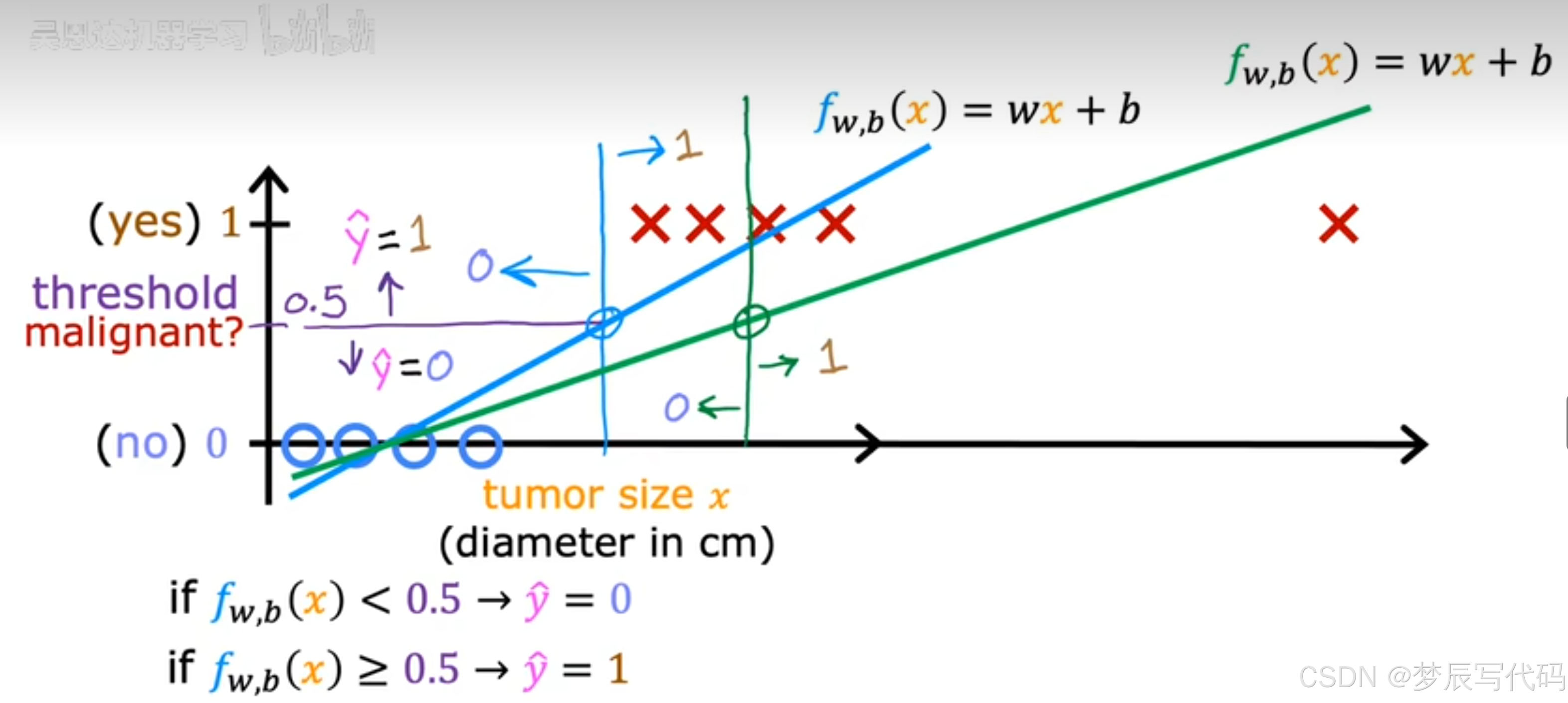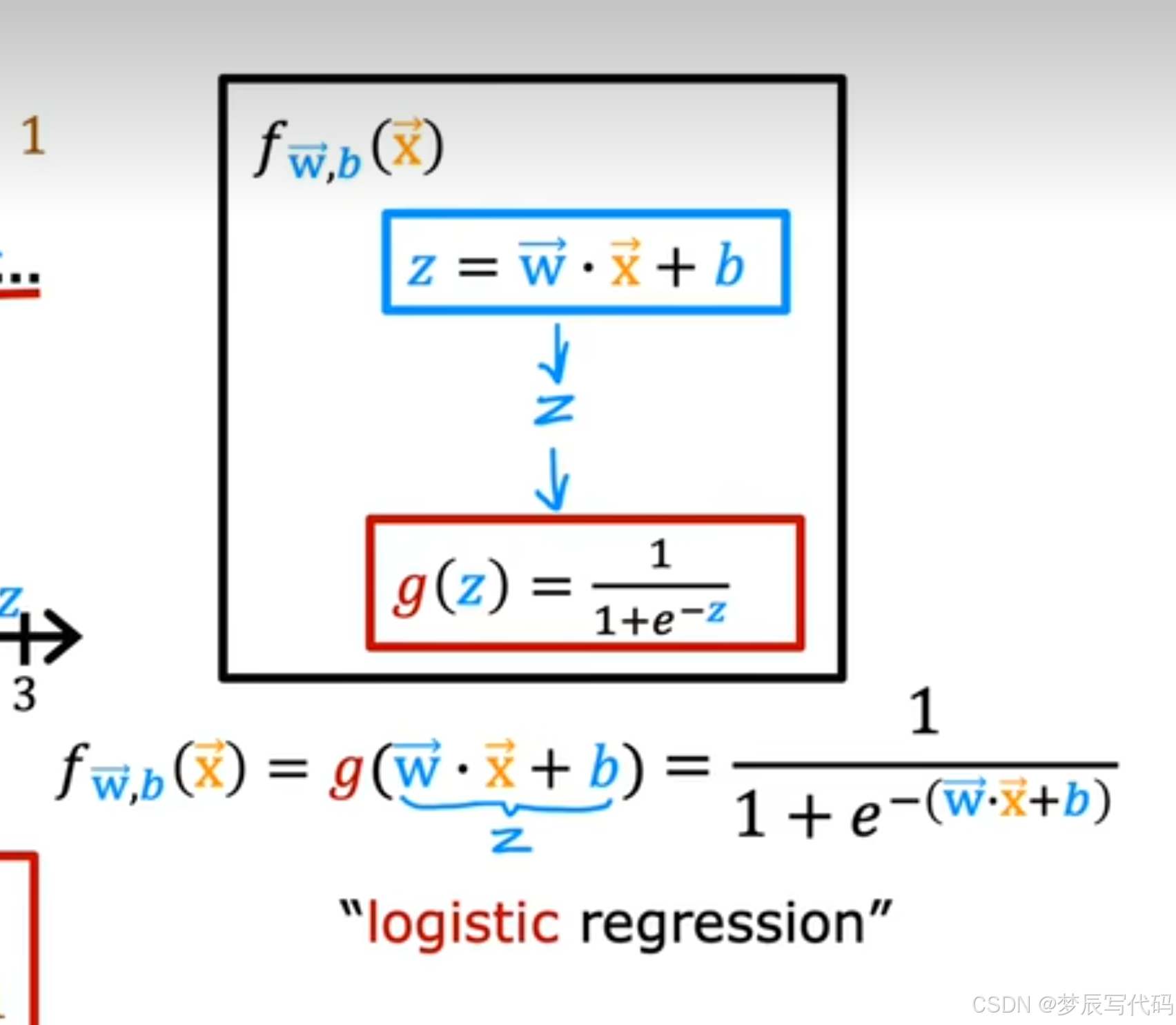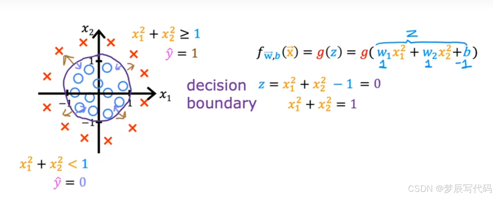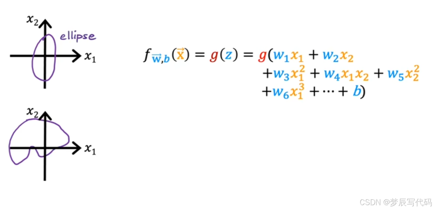 总结:问:为啥么给x设定范围就可以求出1/0,答:因为在逻辑函数中,它表现出来的是在0-1范围内结果为1的概率,没有准确结果,我们需要设置一个阈值使在阈值以上的概率为是,否则为否,那么z也会有范围,z是什么,z是线性回归中的结果,我们只需要通过多项式回归合理的设置好一个函数,通过调整wb参数,完善逻辑回归模型,这个函数的xy轴都是特征项,在阈值内为是,在阈值外为否。