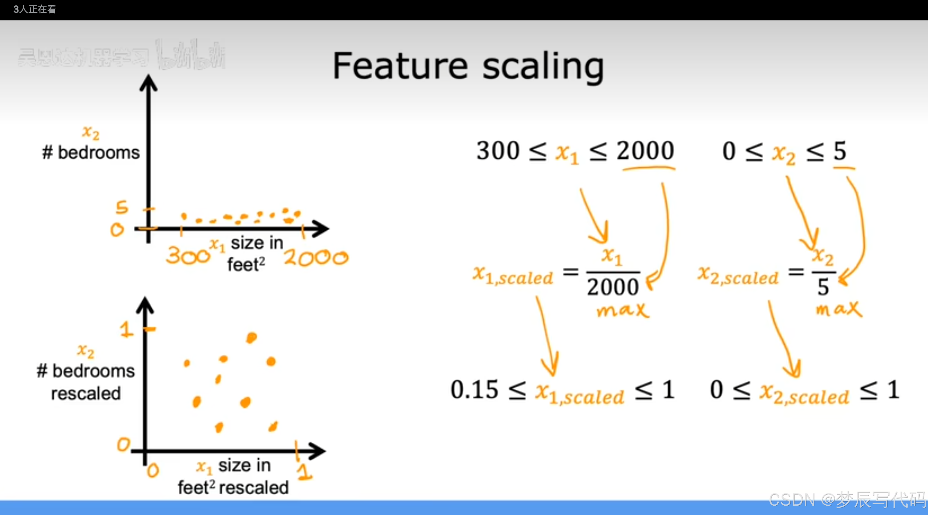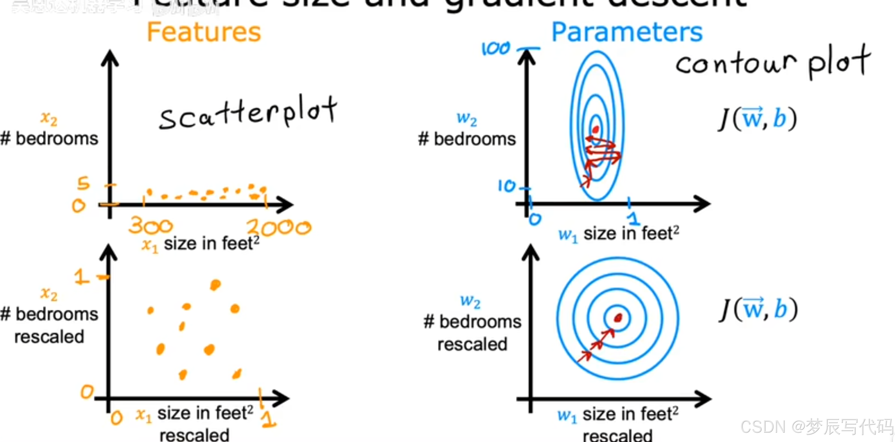 数据点看起来更像这样左下的散点图;你可能会注意到下面的图的比例现在相当和上面的不一样。关键是x1和x2现在都是可比较的,如果你运行梯度下降在这里找到一个成本函数,使用它重新缩放x1和x2变换后的数据,轮廓看起来会更像圆圈(右下)(为什么会变成圆圈参考绿色字体解释),梯度下降法可以通过更直接的路径到全局最小值,缩放后更容易找到合适的w和b参数值。