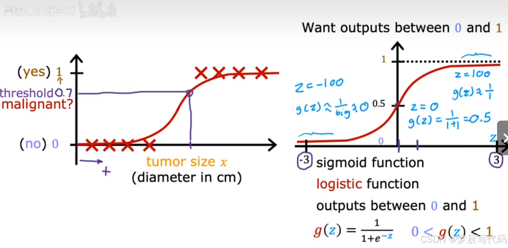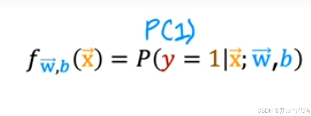 上图解读:两个f(x)不是一个东西,上面的f(x)=z=wx+b,然后将z带入到g(z)函数中,下边的f(x)是重新定义的一个函数,它的作用是预测是否为肿瘤的概率,他的x(因变量)是我们在线性回归中的结果f(x),这个重新定义的f(x)就是是肿瘤的概率,也就是表现为1的概率,如下图