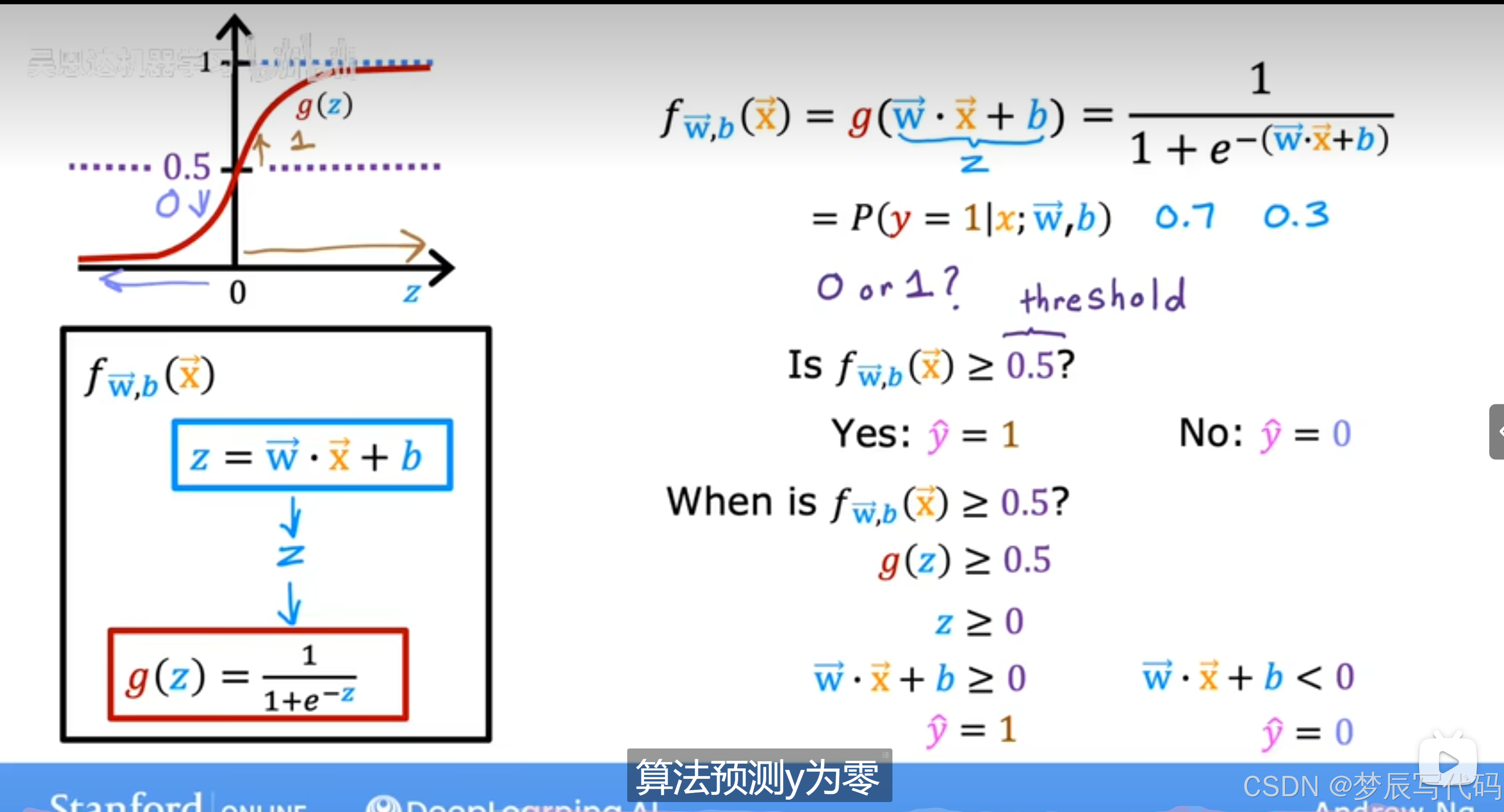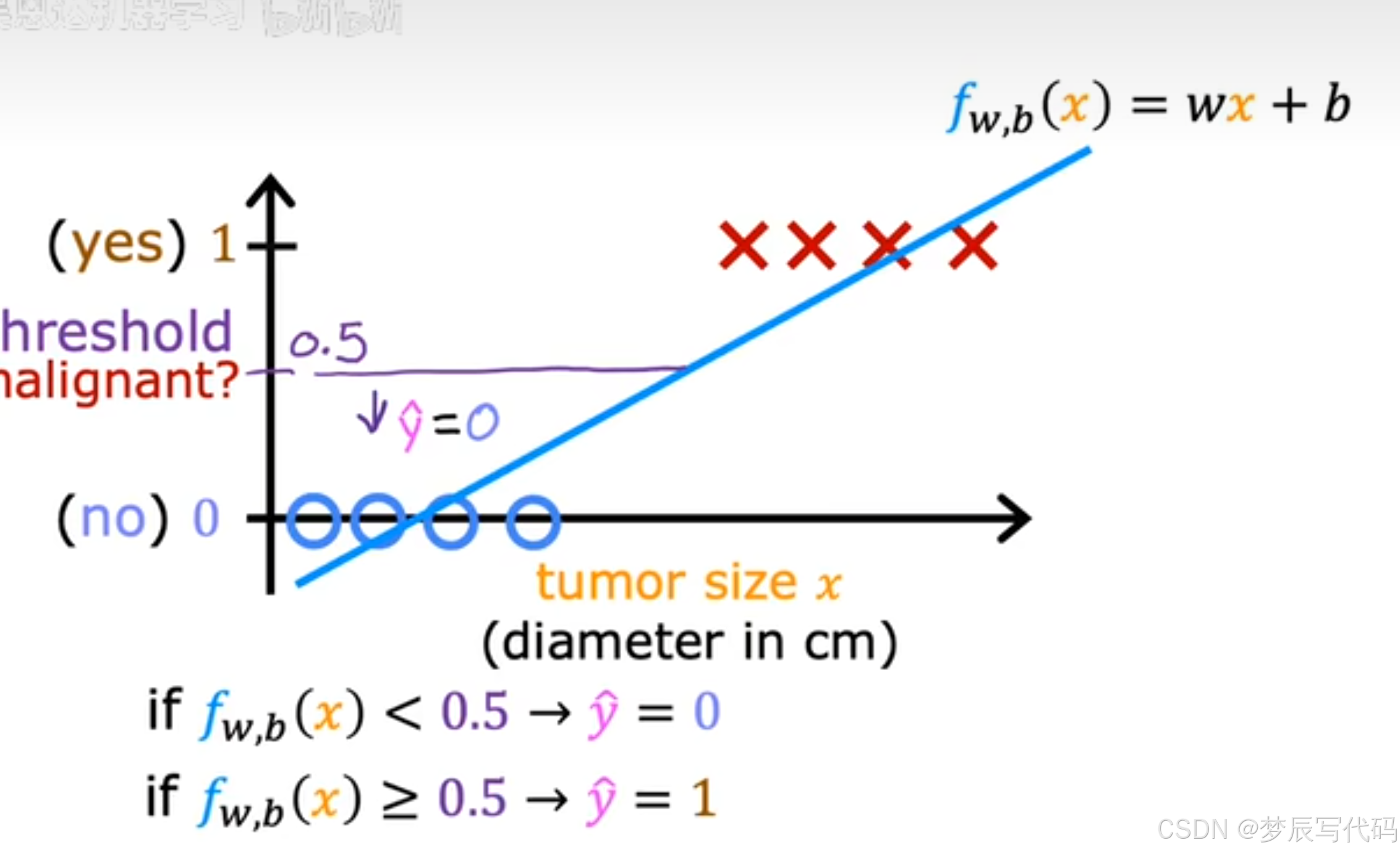 由于我们通过激活函数定义出来的是结果为1的概率,但是我们想要让机器预测为肯定的1或0,因此我们可以通过设置一个阈值,使f(x)在这个阈值上被预测为1,下被预测为0,