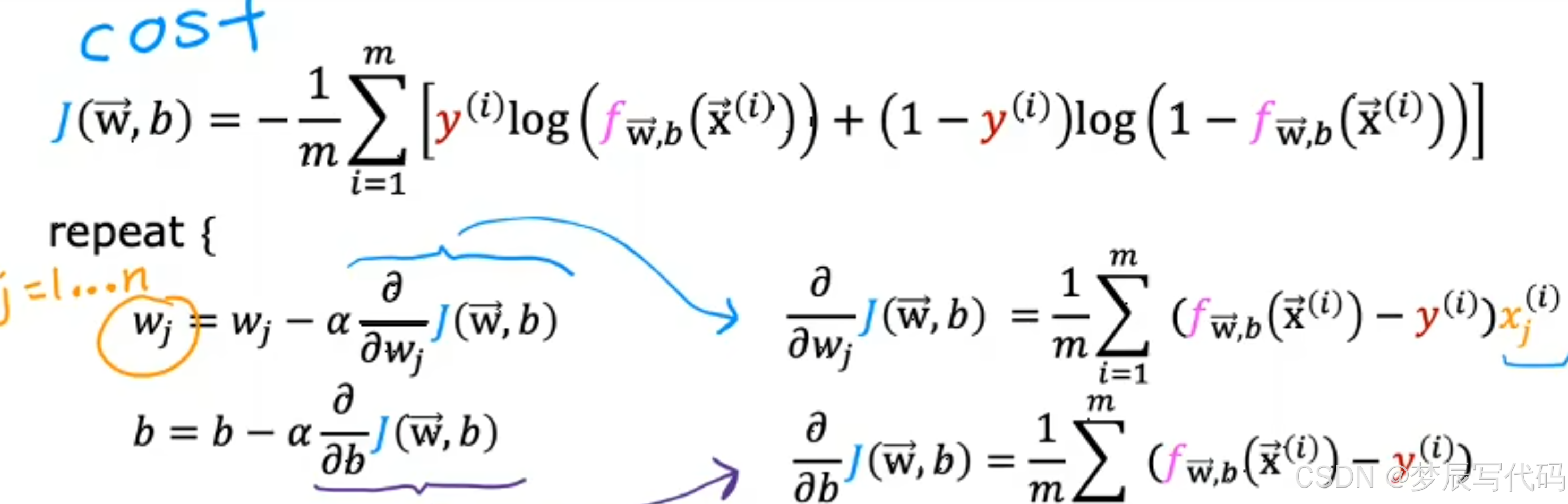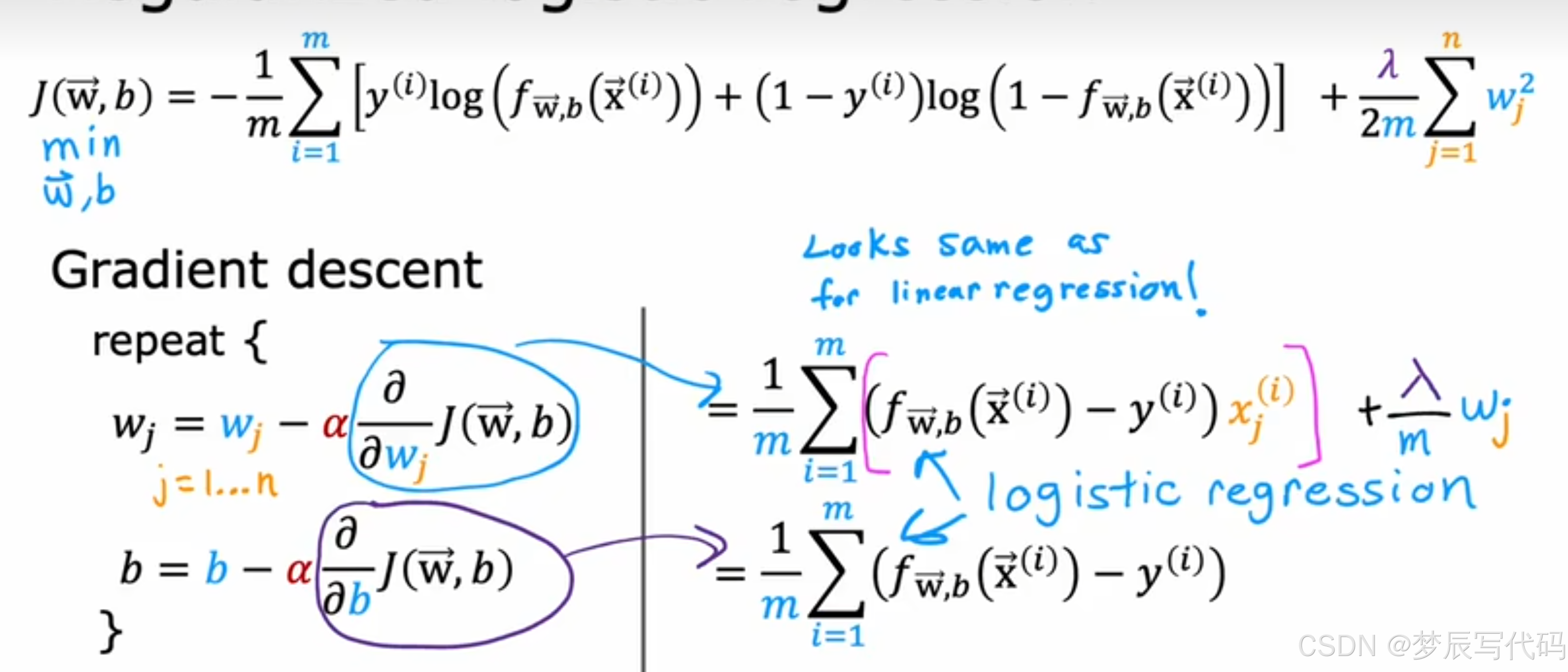 逻辑回归的梯度下降的式子与线性回归的梯度下降的式子相同,当时实际上他俩的区别在于他们的f函数的定义不同,以下是他们的区别