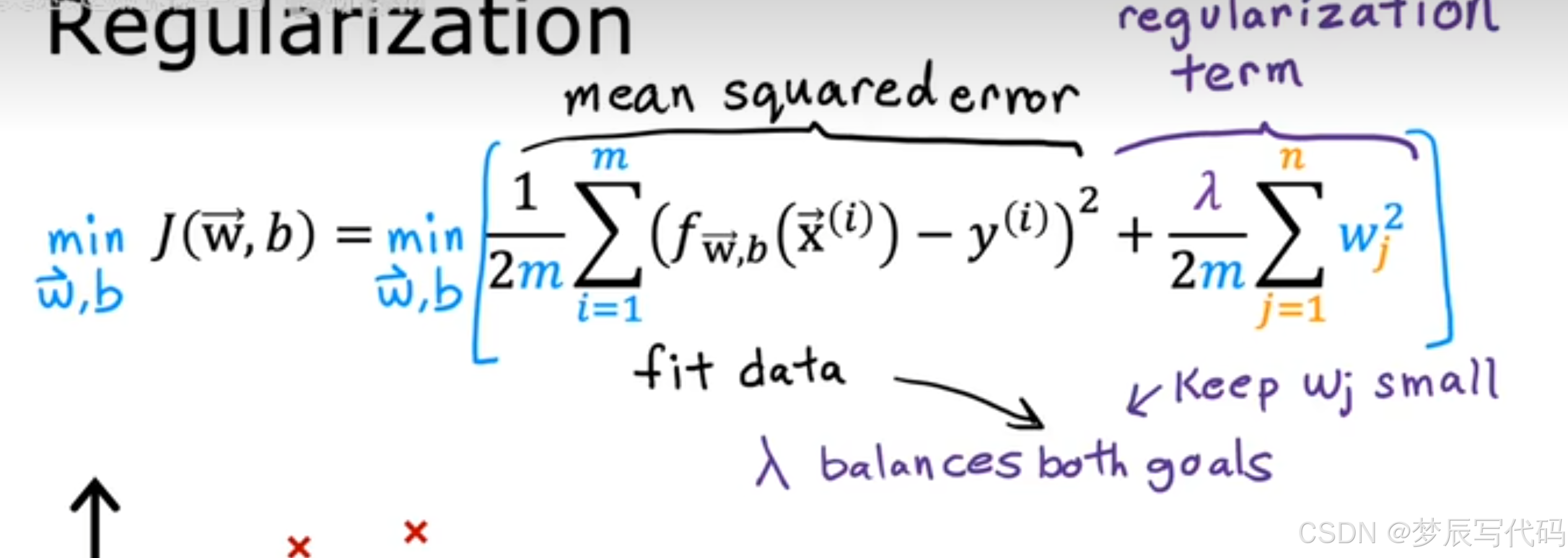 第三种方法:正则化,正则化是一种数学方法,通过正则化线性回归和逻辑回归里的成本函数和损失函数,以及对应的梯度下降公式参数,我们可以有效的减少作用微乎其微的特征x的参数,从而达到让每一个特征x都有属于他自己的合适的权重。