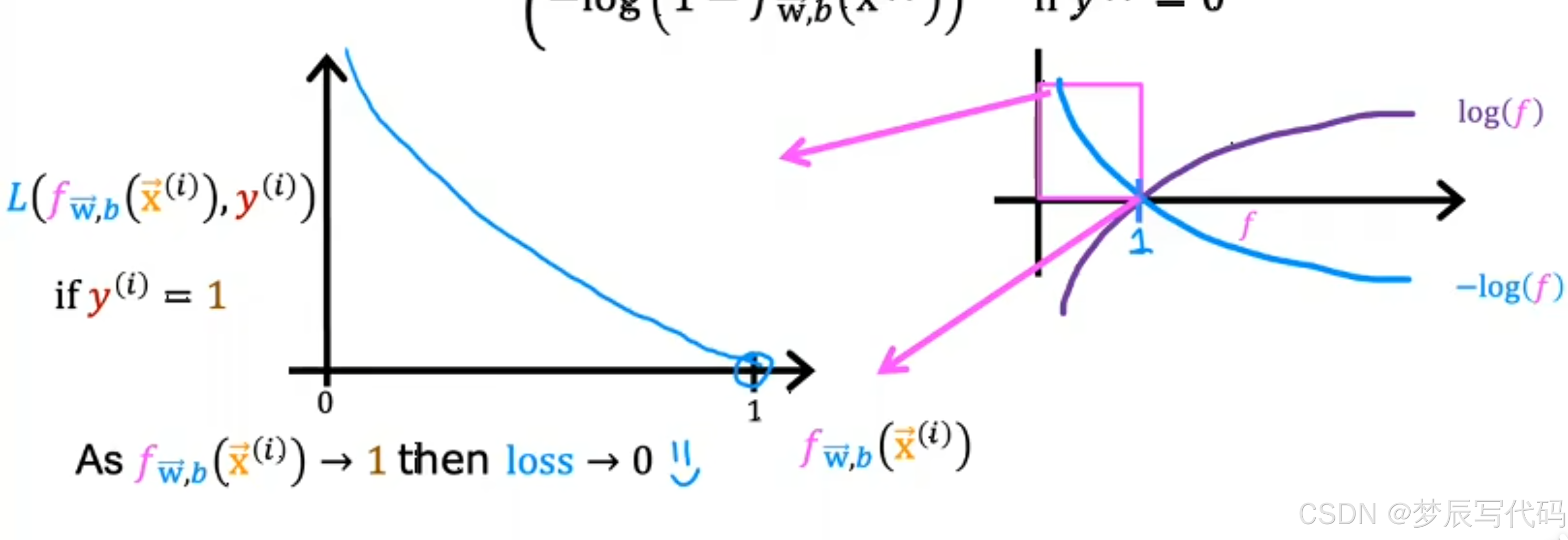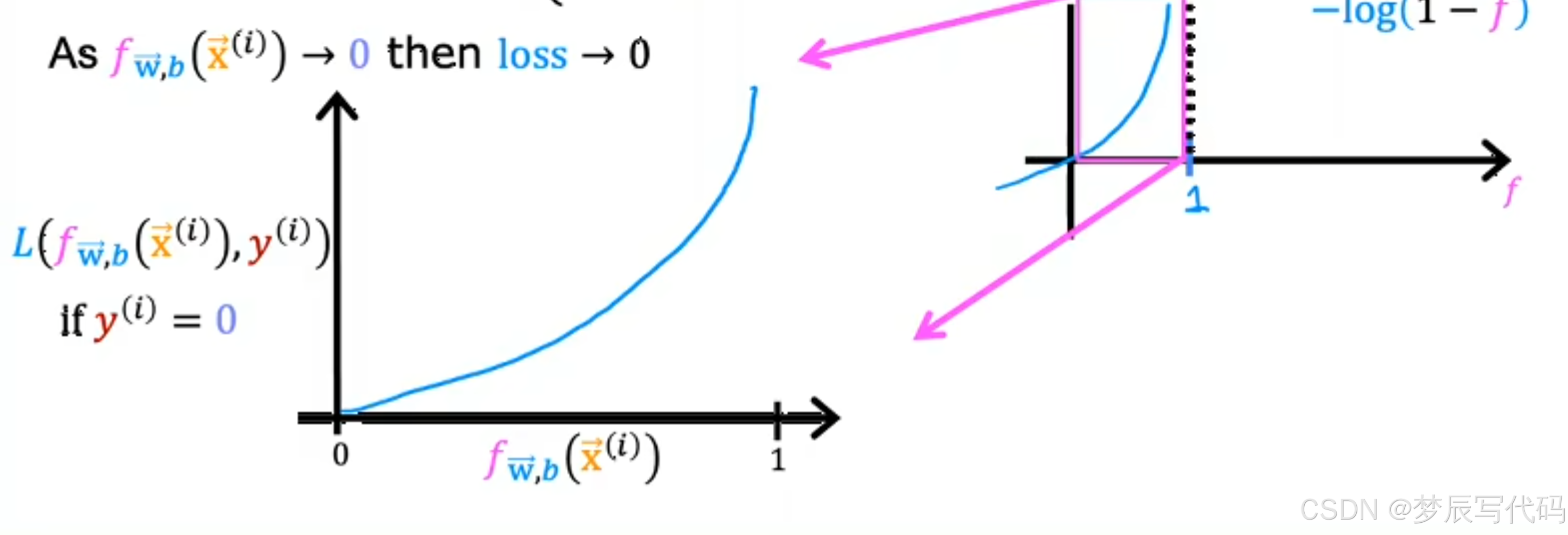 图像解释:我们都会算ln函数,(没写底数就是ln函数)当我们预测值(logictic函数算出来的数)为x时,实际值为1,如果x越接近1,在函数中就越小,这样算到成本函数误差是不是就越小,同理,如果越接近零,我们预测是不是就越错误,那他函数越大,算到成本函数误差就越大,