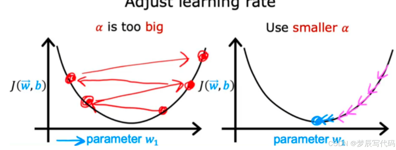 阿尔法是学习率,紫色圈里的是导数,导数为正,w-一个正数向左移j小了,同理w-负数右移,j也小了,合理!我们可以看到,当学习率(下面会具体讲什么是学习率,这里只需要理解是一个人工设定的系数)一定时,导数会随着收敛(w越来越靠近低谷)越来越小,也就是原始w减去的数值越来越小,那么就会慢慢靠近低谷