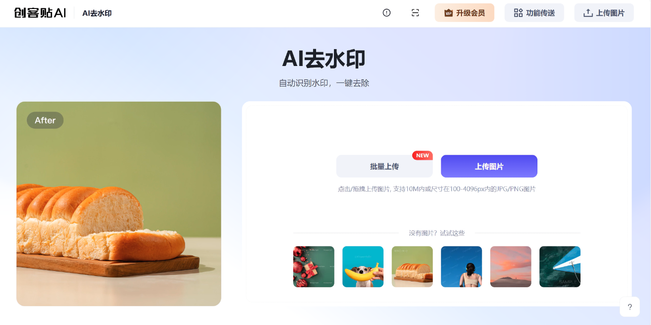 - 在AI去水印页面,上传需要去除水印的图片,等待几秒,自动完成去水印