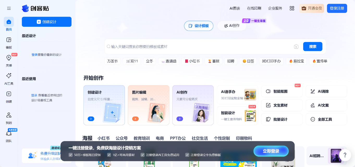 创客贴是一个在线设计网站,打开网页就可以使用AI去水印功能免费实现在线去除水印。除此之外,你还可以借助这个网站强大的设计功能对图片进一步设计,形成海报、小红书配图等,省时又省力。