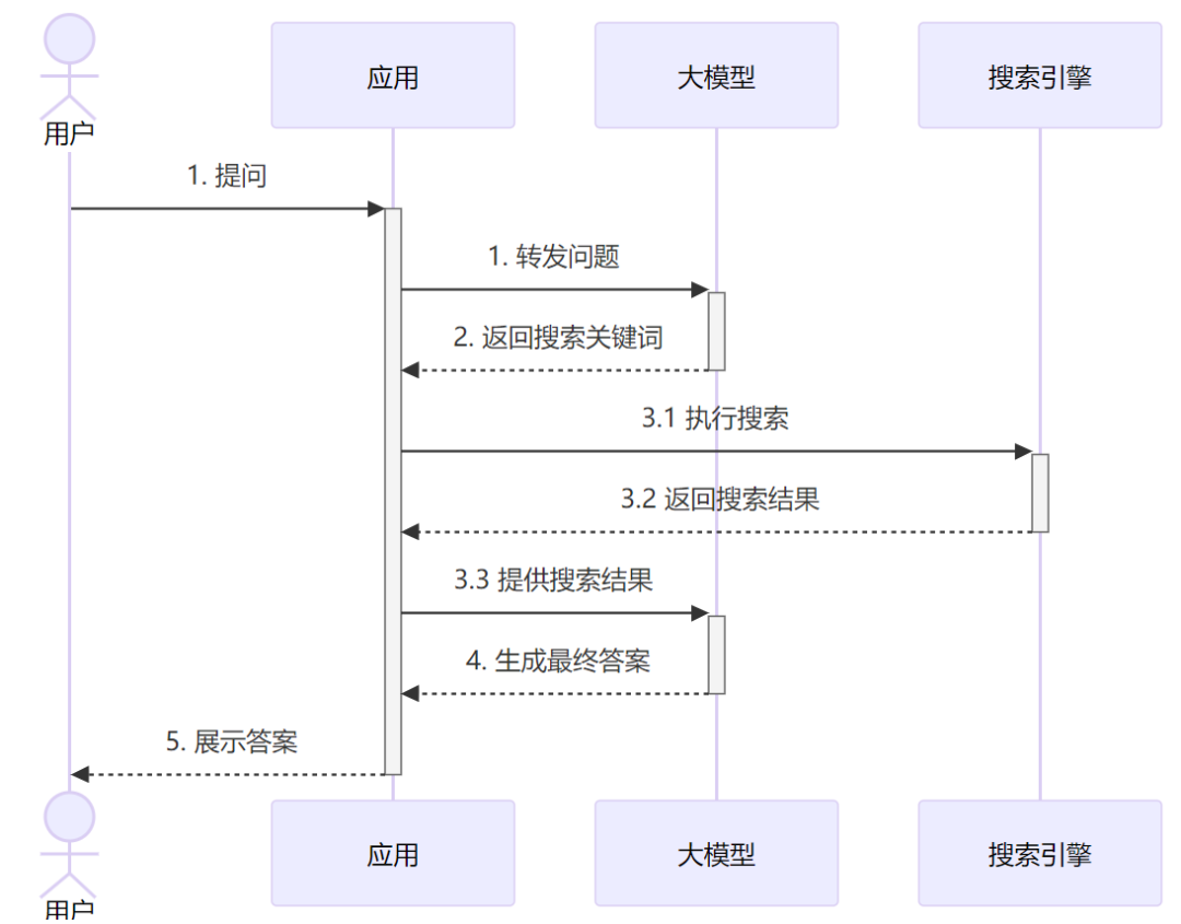 从图中可以看到,为了给用户的问题生成回答,实际上应用和LLM进行了两轮交互。第一轮是把原始问题给大模型,大模型分析问题然后告诉应用需要联网去搜索什么关键词(如果大模型觉得不需要搜索,也可以直接输出答案)。应用侧使用大模型给的搜索关键词 调用外部API执行搜索,并把结果发给大模型。最后大模型基于搜索的结果,再推理分析给出最终的回答。
