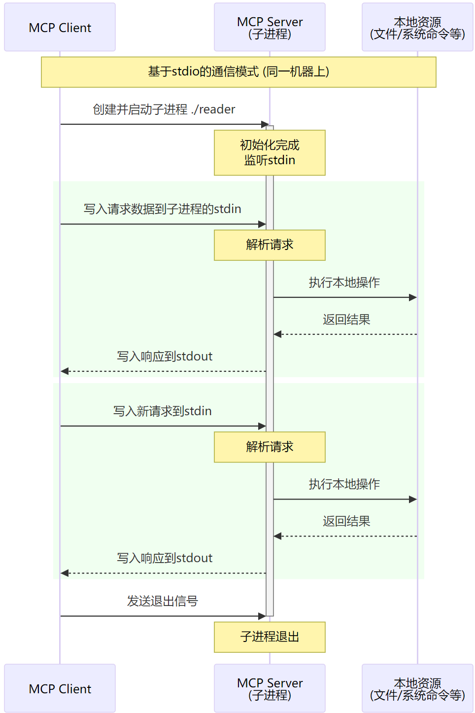 对于local模式的mcp-server,client就会用给定的command来启动子进程,并在启动时拿到stdin stdout的句柄用来读写数据。 但是不论是走网络还是走stdio,client和server之间传输数据的协议(数据结构)都是一样的。